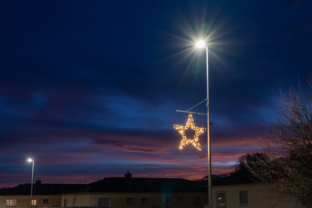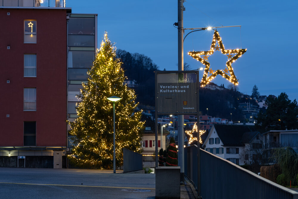 Die Weihnachtsbeleuchtung in Freienbach besticht durch leuchtende Stern-Motive, die direkt an den Straßenlaternen befestigt sind und so den gesamten Ort in ein festliches Licht tauchen. Diese strahlenden Sterne verbinden traditionelles Weihnachtsflair mit moderner Lichttechnik und sorgen für eine warme, einladende Atmosphäre. Ein weiterer Höhepunkt ist der großartig beleuchtete Weihnachtsbaum, der mit sanftem, warmweißem Licht als strahlender Mittelpunkt der festlichen Dekoration fungiert. Die Verwendung energieeffizienter LED-Technologie gewährleistet nicht nur ein brillantes Lichtbild, sondern auch Nachhaltigkeit und Umweltbewusstsein.