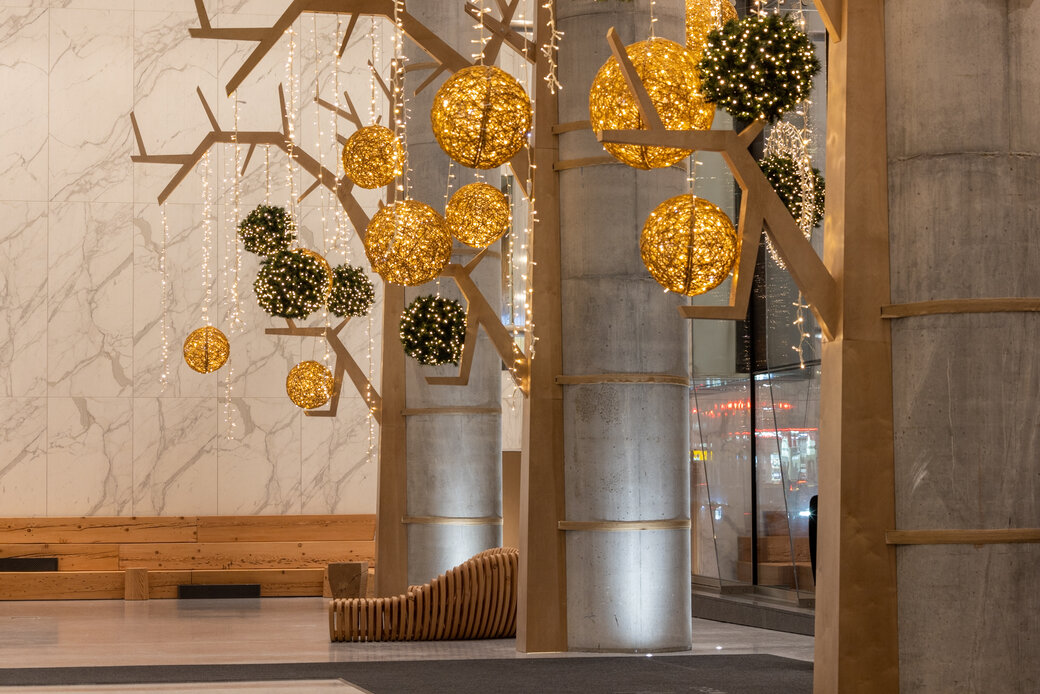 Turn a corporate building into a local landmark with elegant or extravagant façade lighting. Add eye-catching light art or festive decorations for additional impact.