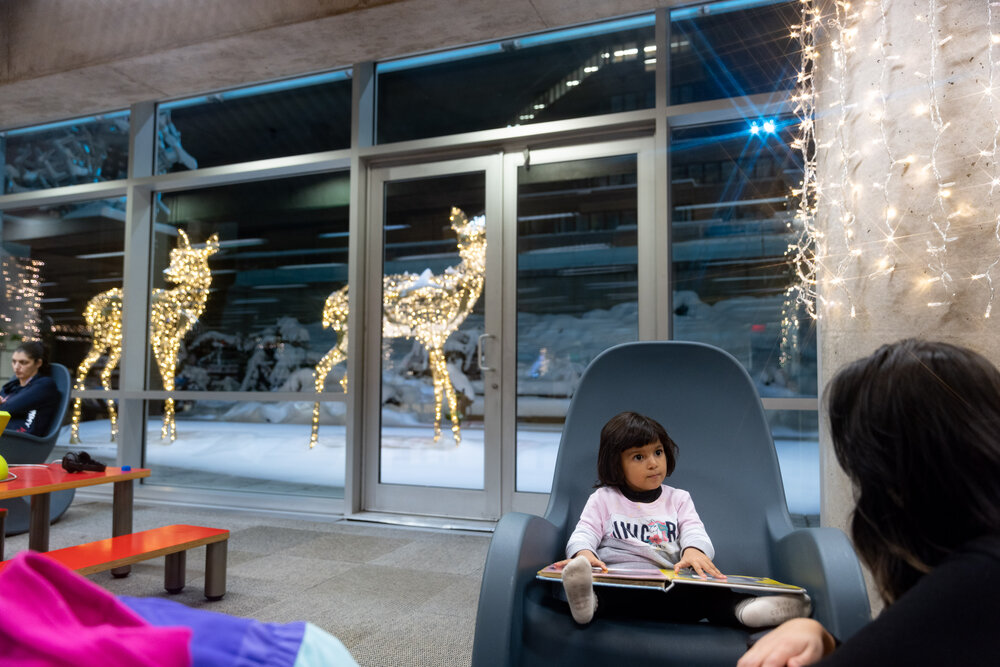 The grand stairs are adorned with cool white glowing icicles, evoking the magic of Quebec's winter. In the Youth Space, two young deer are installed in the indoor garden, reminiscent of the local fauna.