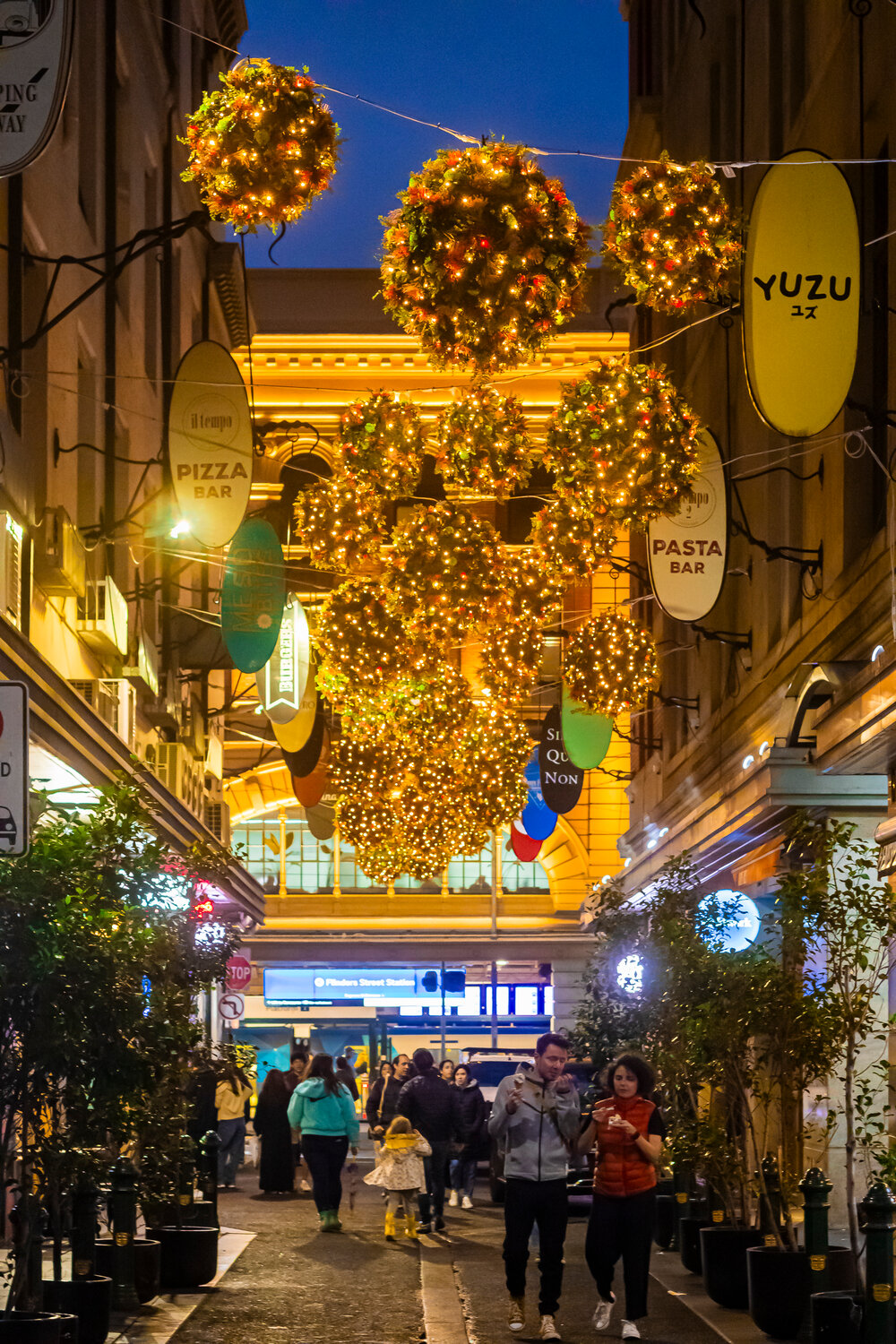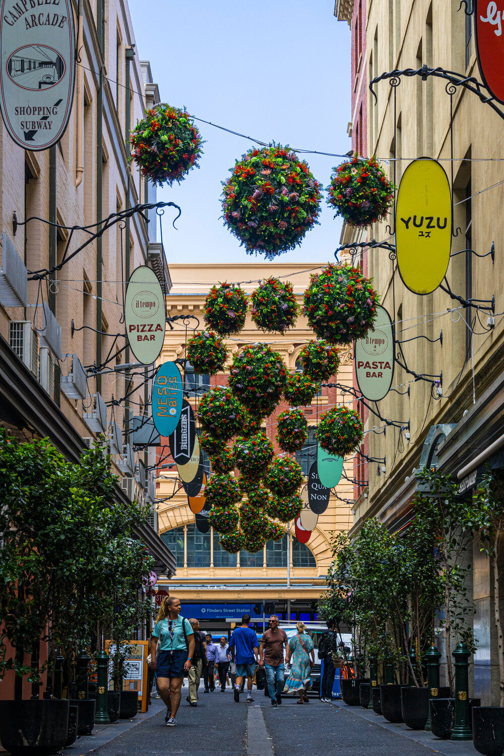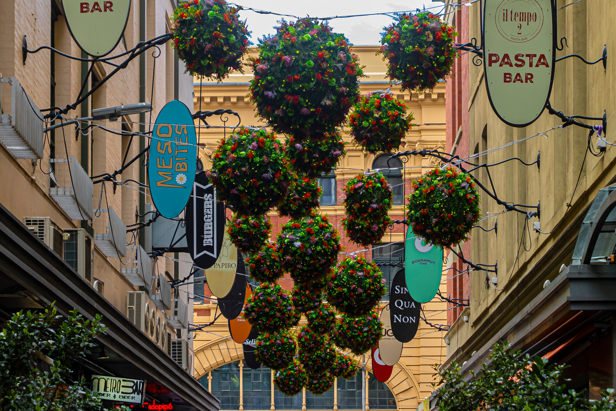MK Illumination Australia proudly presents the Degraves Street Festive decoration project 2023! This first-ever Melbourne project showcases vibrant artificial floral baubles celebrating Australia's native flora. Symbolizing connection and cross-pollination, each flower ball, decorated with indigenous blooms, transforms Degraves Street, an iconic Melbourne laneway, into a dazzling spectacle. As the sun sets, fairy lights within ignite, creating a magical glow that embodies the city's continuous vibrancy.
