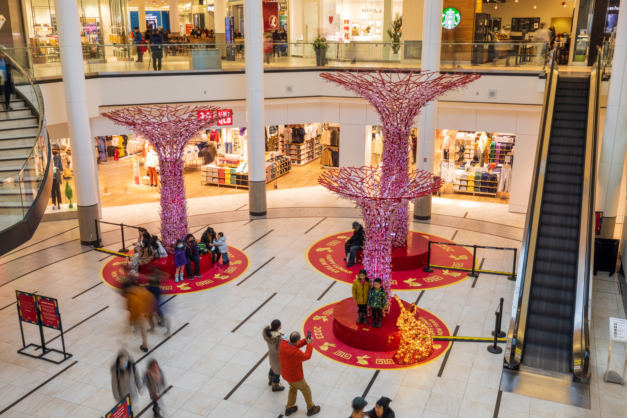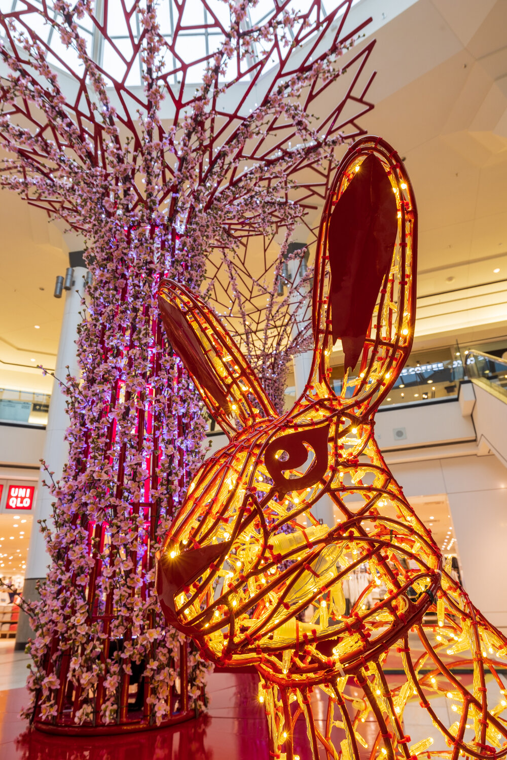 Les troncs métalliques des Supertrees, conçus par MK Illumination, étaient ornés de lumières blanches et de fleurs de pêcher. Nous avons également ajouté un revêtement de sol en vinyle personnalisé et des lapins de cinq pieds de haut avec des cadres rouges et des lumières dorées pour représenter le signe du zodiaque chinois de 2023, un symbole important qui peut facilement être remplacé chaque année pour correspondre au nouveau signe. L'effet global offrait une expérience immersive pour les locataires et les clients.