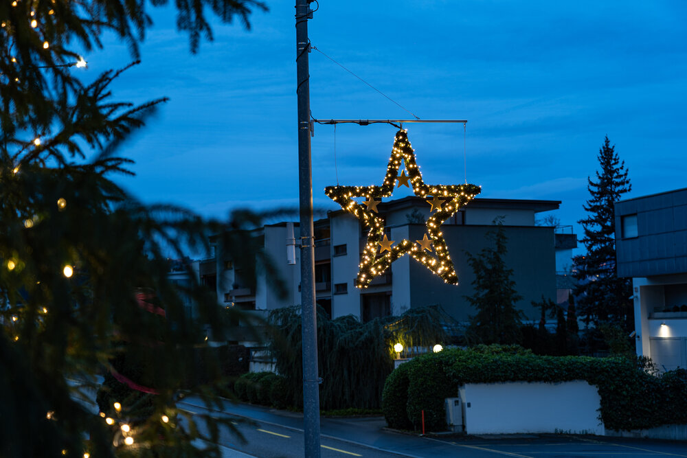 Die Weihnachtsbeleuchtung in Freienbach besticht durch leuchtende Stern-Motive, die direkt an den Straßenlaternen befestigt sind und so den gesamten Ort in ein festliches Licht tauchen. Diese strahlenden Sterne verbinden traditionelles Weihnachtsflair mit moderner Lichttechnik und sorgen für eine warme, einladende Atmosphäre. Ein weiterer Höhepunkt ist der großartig beleuchtete Weihnachtsbaum, der mit sanftem, warmweißem Licht als strahlender Mittelpunkt der festlichen Dekoration fungiert. Die Verwendung energieeffizienter LED-Technologie gewährleistet nicht nur ein brillantes Lichtbild, sondern auch Nachhaltigkeit und Umweltbewusstsein.