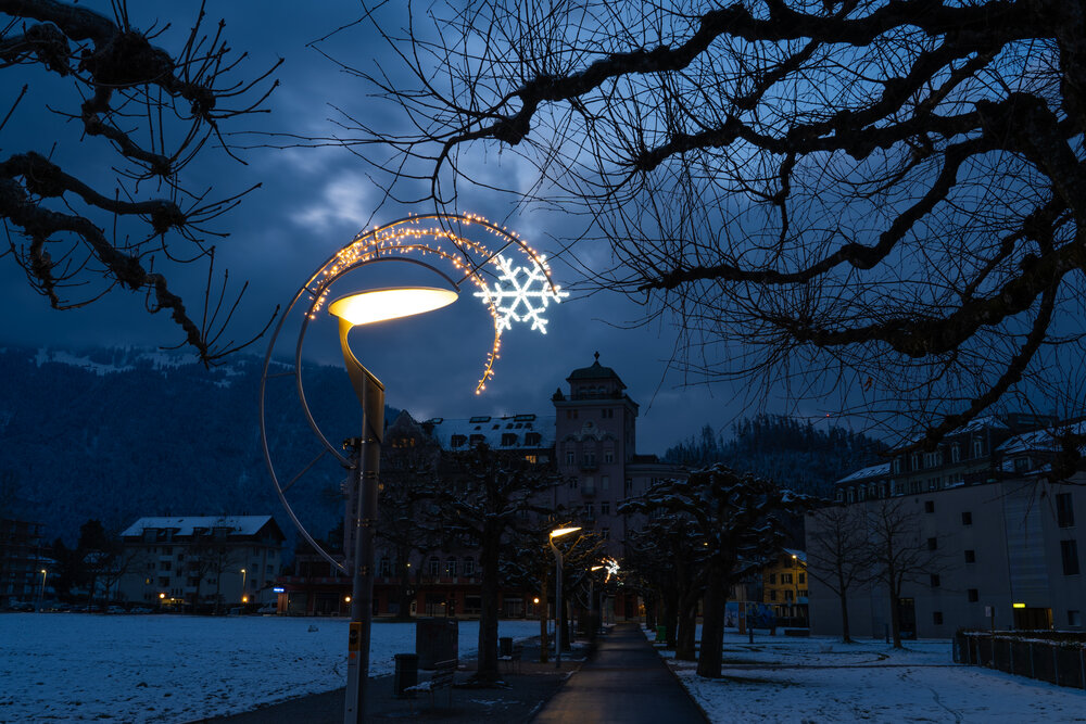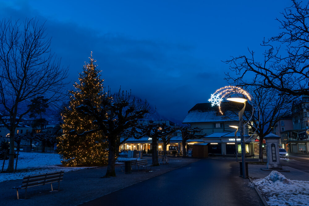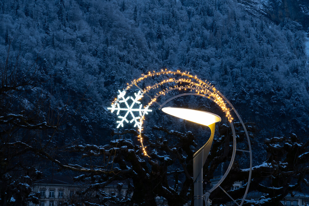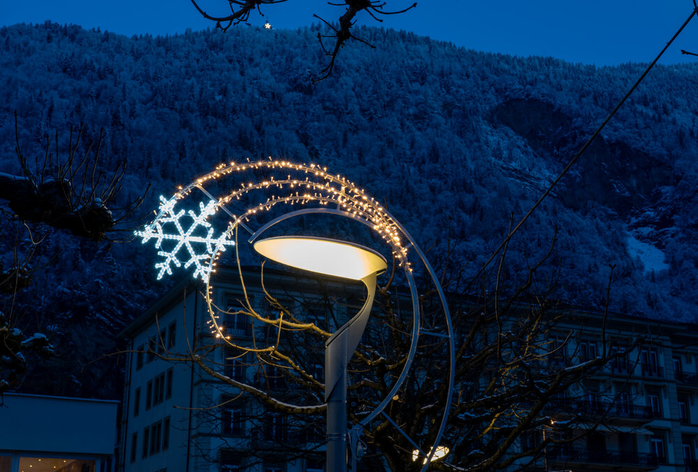 À Interlaken, les illuminations de Noël se caractérisent par d'élégants motifs de lanternes lumineuses, artistiquement fixés aux lampadaires, créant ainsi une ambiance festive le long des rues principales. L'ensemble est complété par un magnifique sapin de Noël illuminé, qui fait office de point central rayonnant de la décoration.