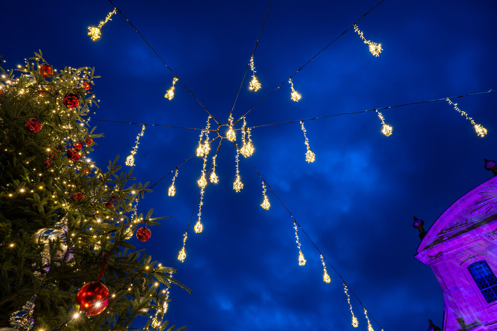 Im Fokus des Designs stehen ein festlich beleuchteter Weihnachtsbaum und elegante Überspannungen aus Lichterketten die sich harmonisch entlang der Straßenzüge und über Plätze erstrecken.