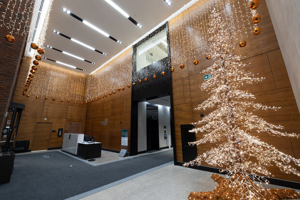 The ice rink is framed by regal nutcrackers and ornate windows.