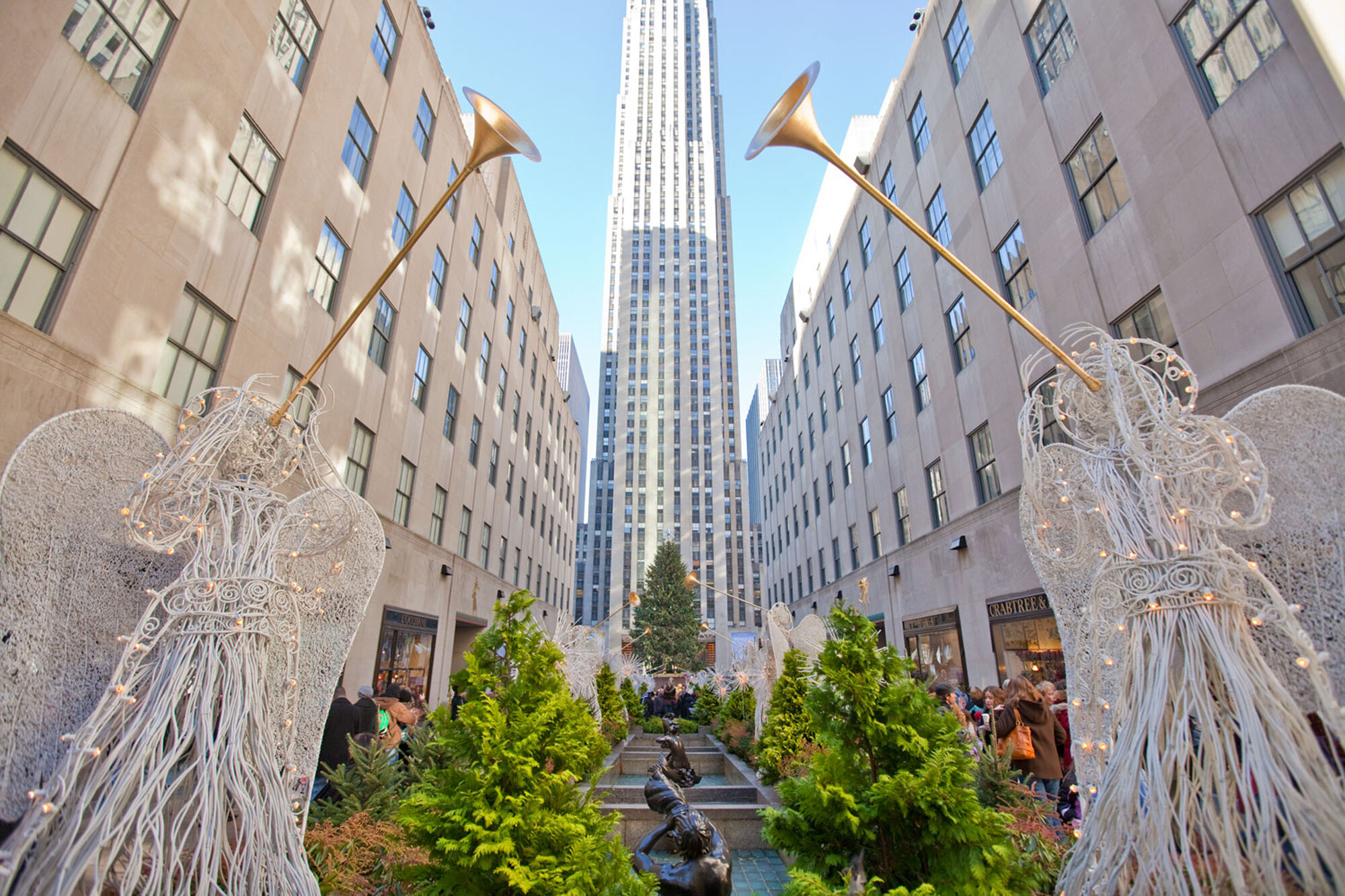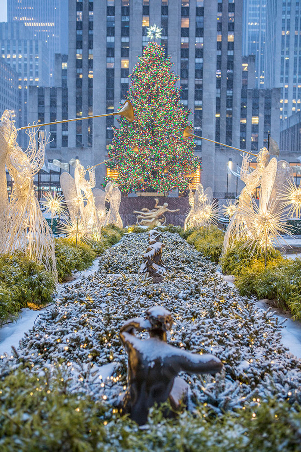 Throughout the year, the Rockefeller Center Channel Gardens bloom with unique floral arrangements, but as the holiday season approaches, the plaza is transformed into a dazzling display of glowing angels and a spectacular Christmas tree.