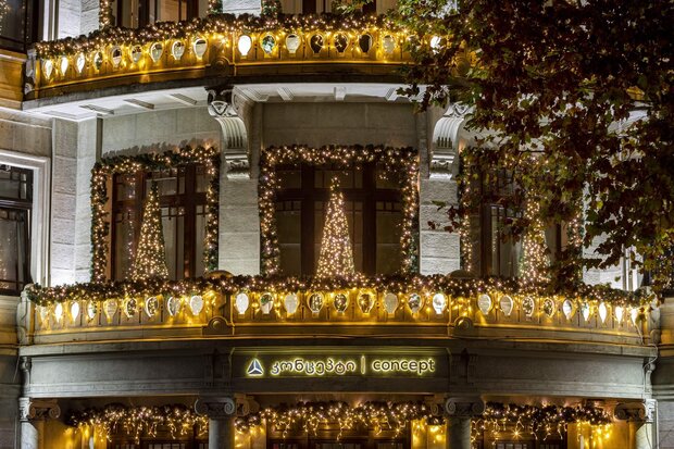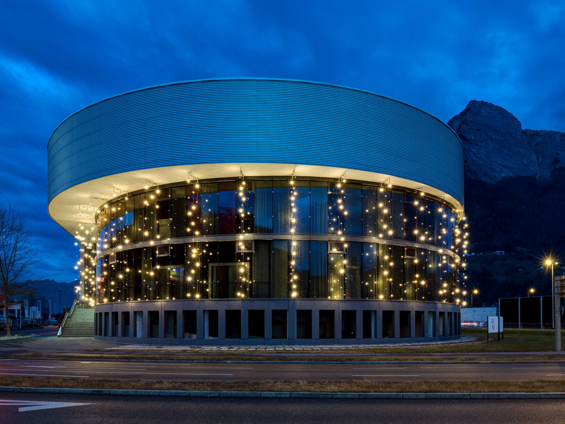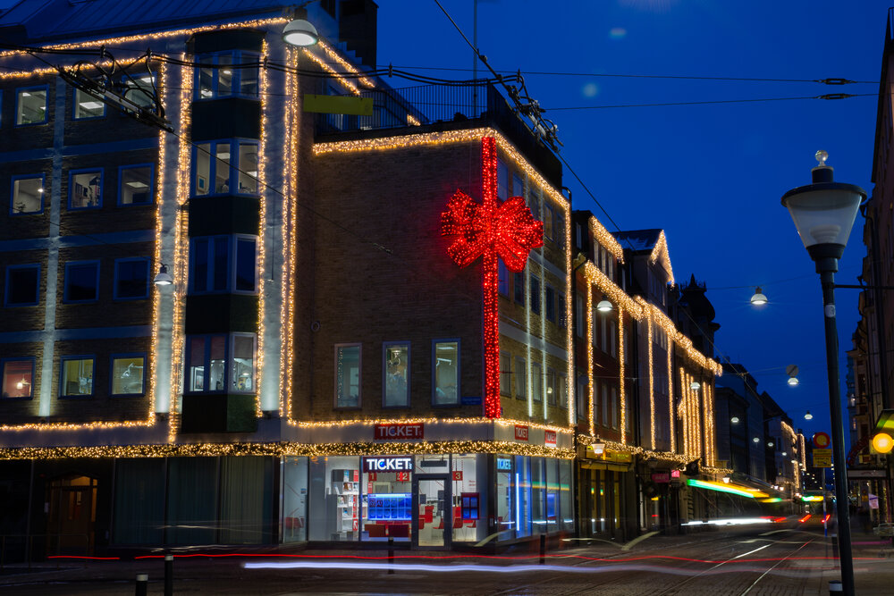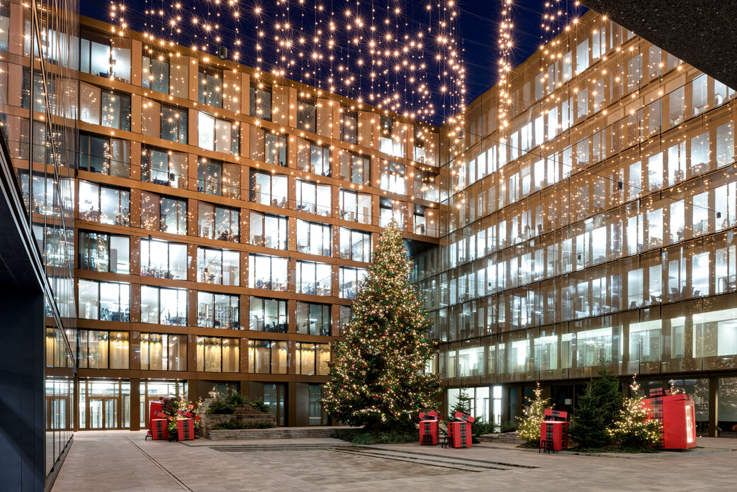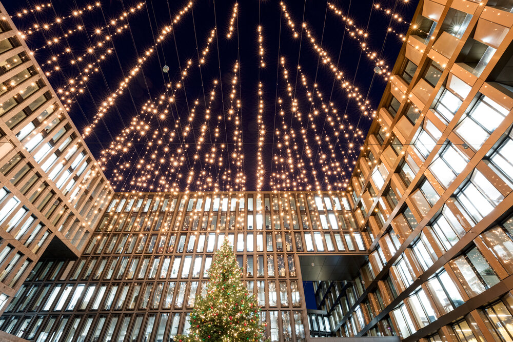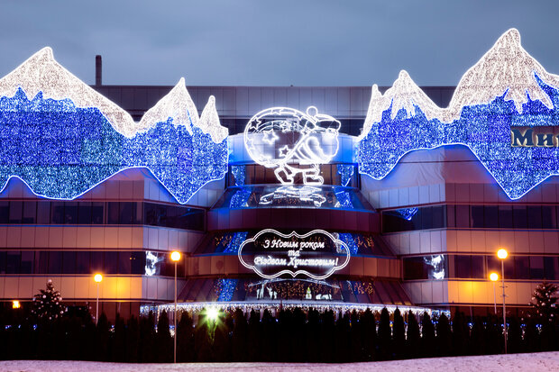 Turn a corporate building into a local landmark with elegant or extravagant façade lighting. Add eye-catching light art or festive decorations for additional impact.