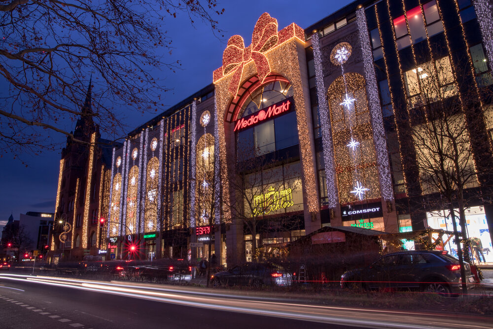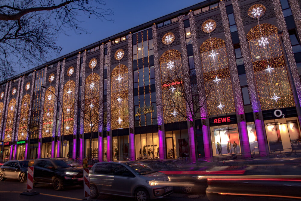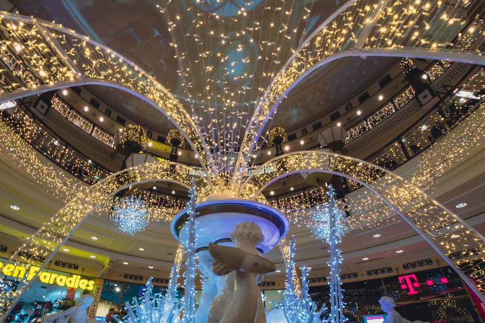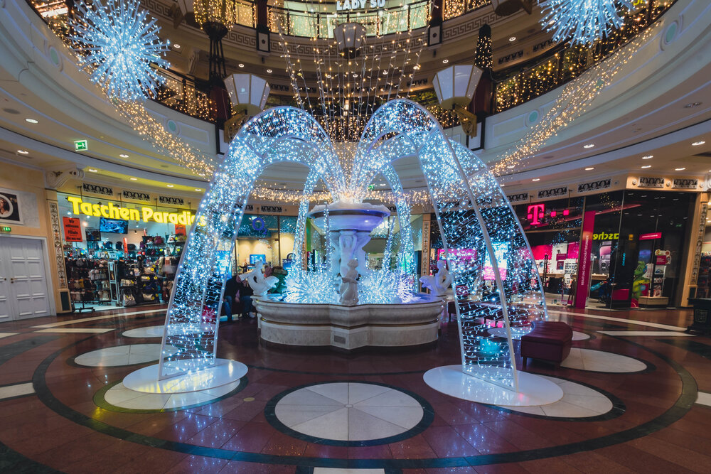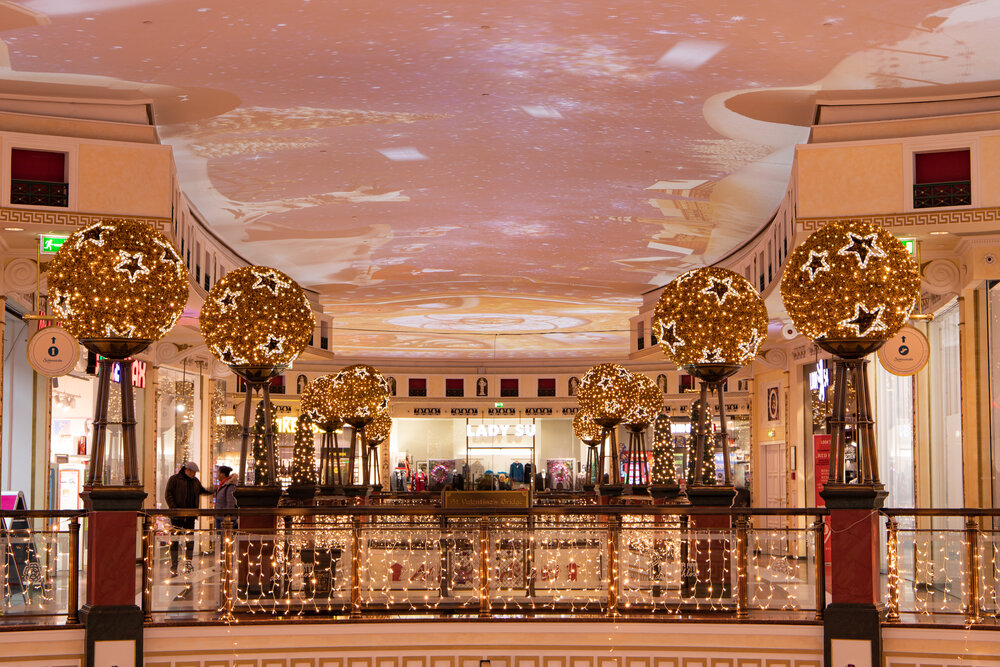 Eine schöne Herausforderung für das Team von MK Illumination Austria, dem Gebäude einen besonderen weihnachtlichen Glanz zu verleihen und dabei seine architektonischen Besonderheiten leuchtend zu inszenieren. Mit einem funkelnden Lichterband, das sich um die ganze Fassade des Gebäudes windete, kombiniert mit warmweißen Lichtvorhängen und charmanten Schneeflockenmotiven gelang es, den Zauber des Schlosses nochmals märchenhaft zu verstärken. Auch das Innere des Centers präsentierte sich mit opulenten Kugeln und mit Sternenglanz in bestem weihnachtlichem Schein.