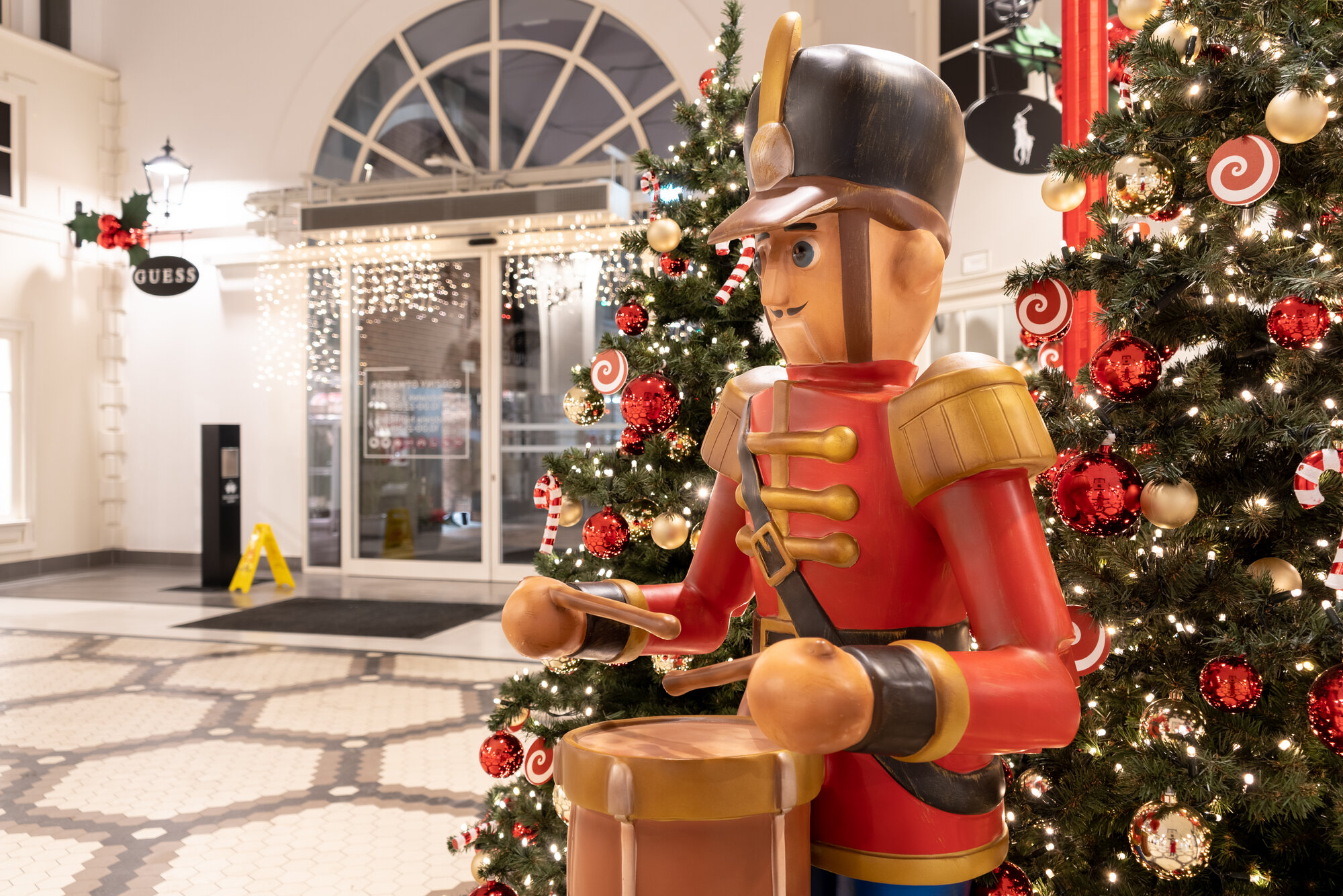 We used overscaled motifs of holy with it's fruits along the corridors, numerous magic light garlands floating through the spaces and the nutcrackers figures bringing out the magical spirit of Christmas all around. The feeling is pointed up with details like the red ribbon wrapping around all the lamp poles or candy stick decors on Christmas trees. Eventually the concept provided a place of escape from everyday disturbance and gave visitors an opportunity of diving in the real mood of that special holiday.