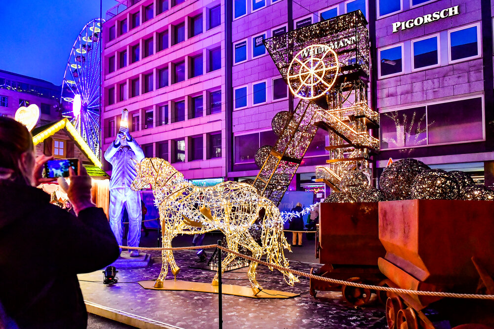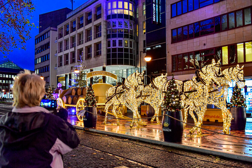 Under the motto "Pomp im Pott", the protagonists of Christmas City Dortmund have realised an innovative lighting concept for 2021. The large-scale installations take visitors on a journey through Dortmund's history. Along numerous decorative highlights, visitors embark on a magical journey through the new and old Dortmund with traditional stories, funny clichés, colourful art, modern light installations and interactions.