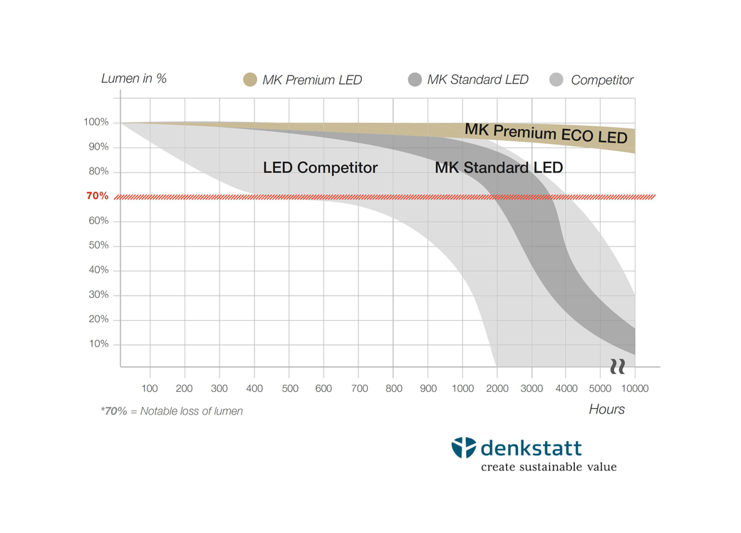 En undersøgelse foretaget af eksterne eksperter fra Wiens miljøkonsulenter denkstatt bekræfter at MK-lyskæder har det mindste CO2-fodaftryk på grund af deres lange levetid.