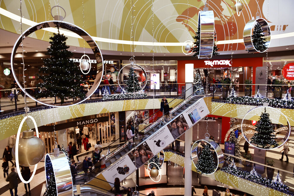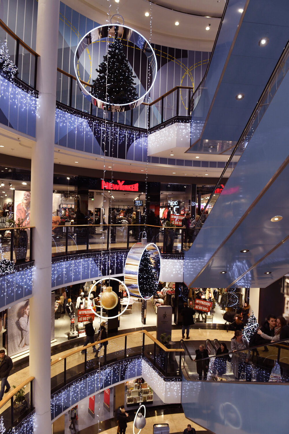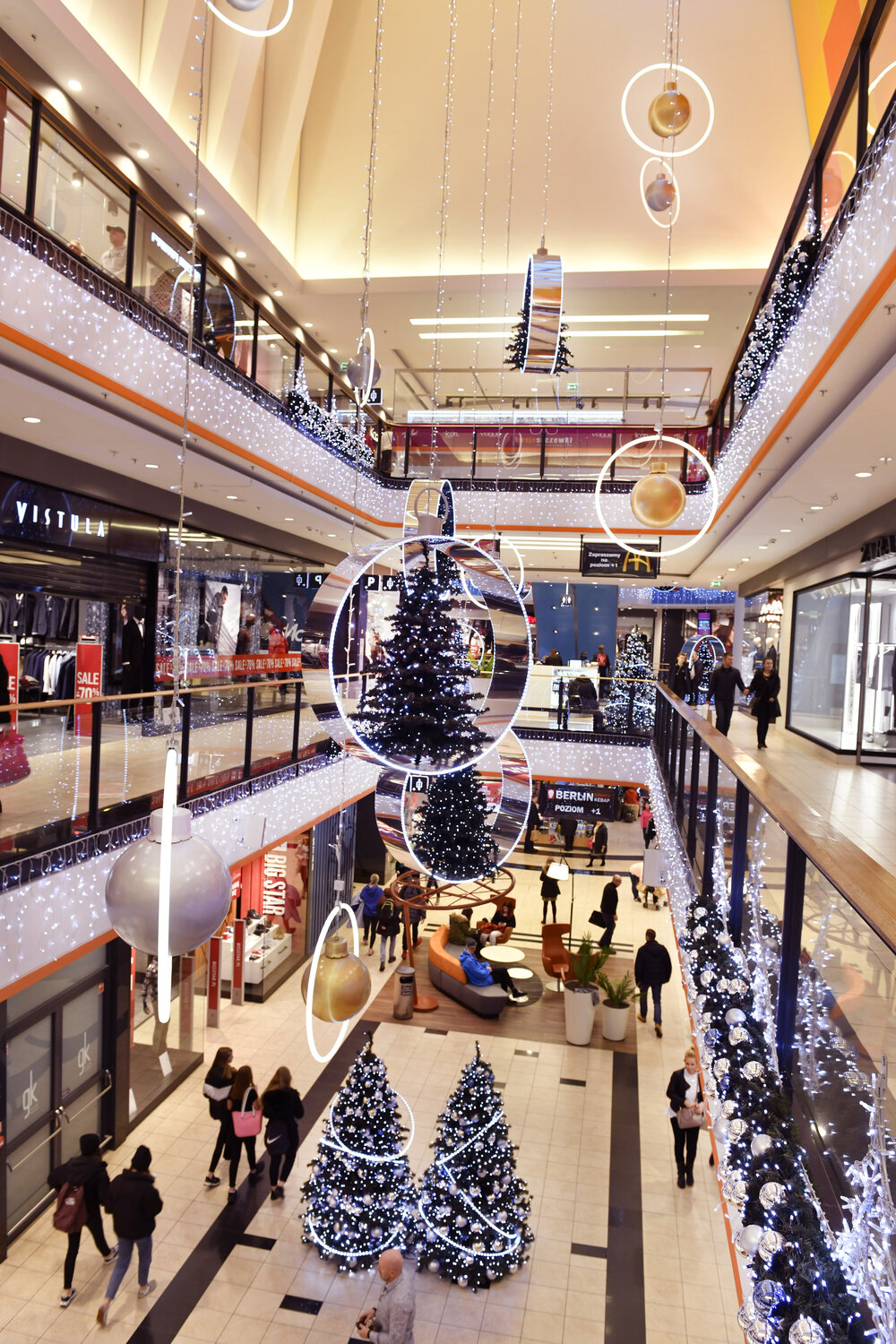 As visitors walked through the center, visitors saw extremely decorative baubles everywhere, and in all the skylights there were Christmas trees set up in mirrored circles, the shape of which was inspired by Christmas tree baubles. The effect of the gallery's lighting was complemented by the decoration of the balustrades.