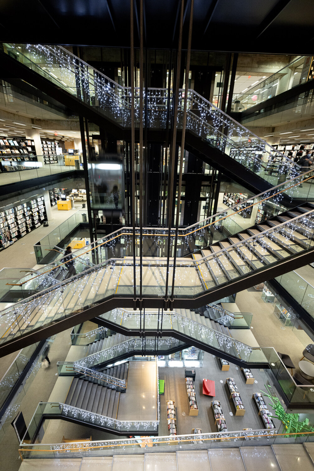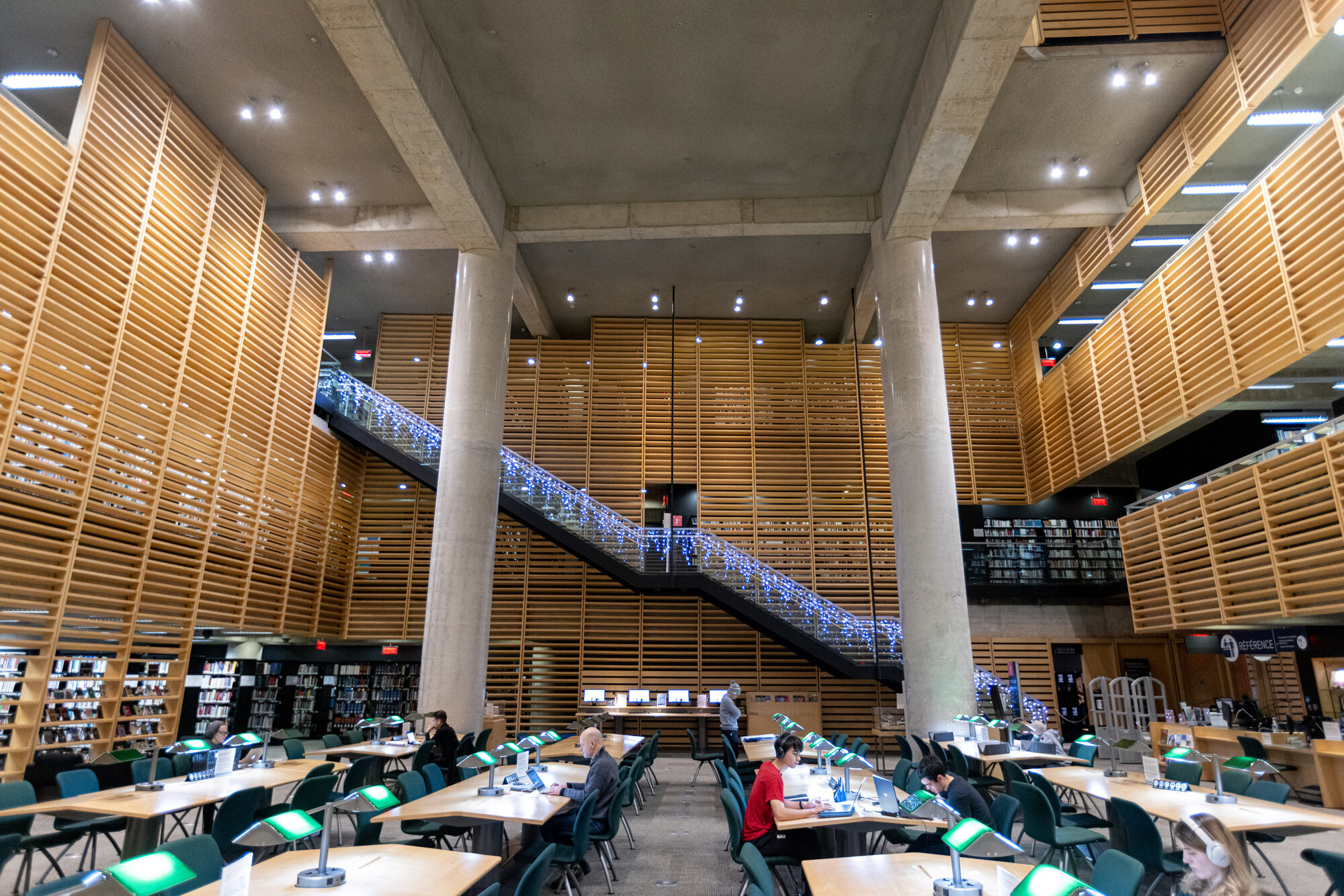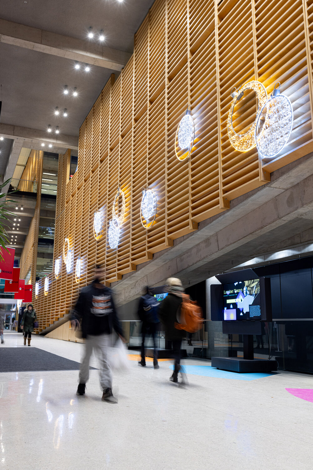 A simple and elegant decor for the largest French-speaking library in North America. Giant 2D balls, illuminated by warm white and cool white LEDs, blend harmoniously with the wood of the entrance hall.