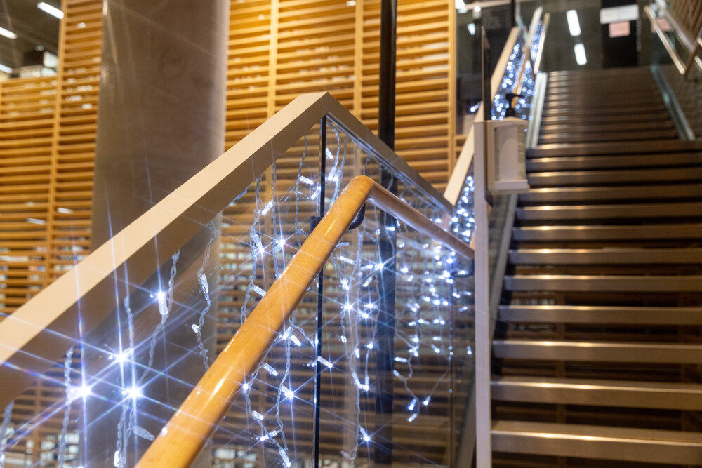 The grand stairs are adorned with cool white glowing icicles, evoking the magic of Quebec's winter. In the Youth Space, two young deer are installed in the indoor garden, reminiscent of the local fauna.