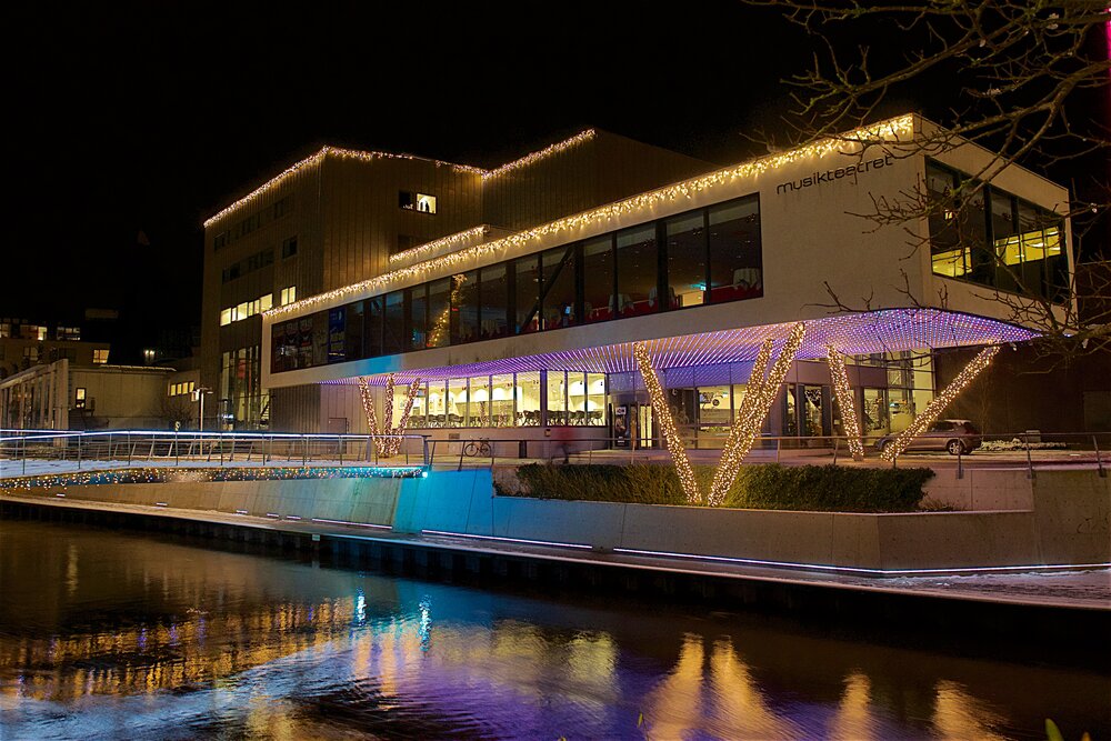 Holstebro valgte at samarbejde med os for at identificere de specielle kendetegn ved byen og valgte at musikteateret, byens kirke og rådhuset samt en masse statuer skulle belyses og pryde byen.