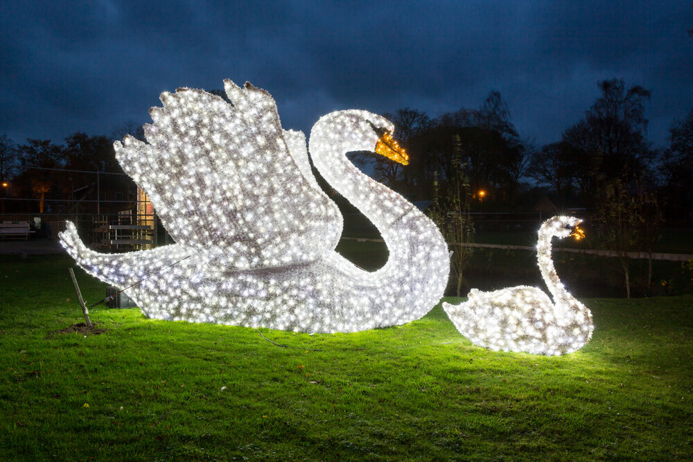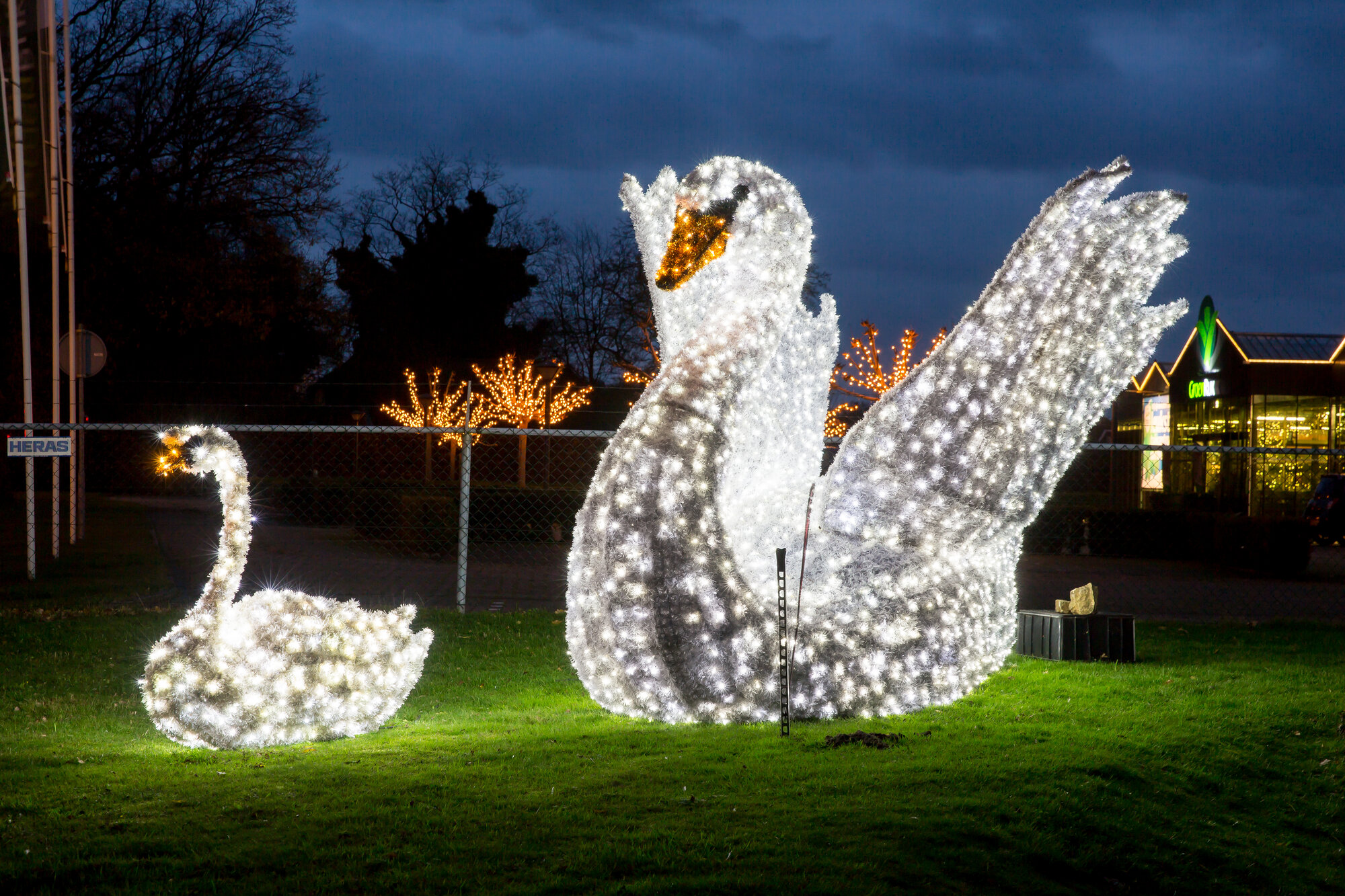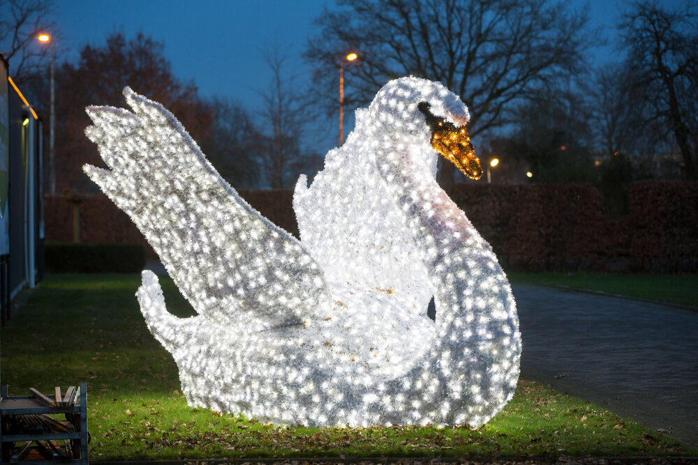 Bright white and imposing in stature, the mother and baby swan recently glided out into the world from MK Illumination's own factory in Presov, Slovakia, and into the pool of the Holtkuile shop in Raalte, Holland. Where plants, flowers and garden accessories are on offer, the two swans now create a very special magic and elegant lighting atmosphere. It is no coincidence that the light motifs from Presov have all been awarded quality certificates - after all, they are made by hand, with great attention to detail and countless fairy lights to create larger-than-life installations.