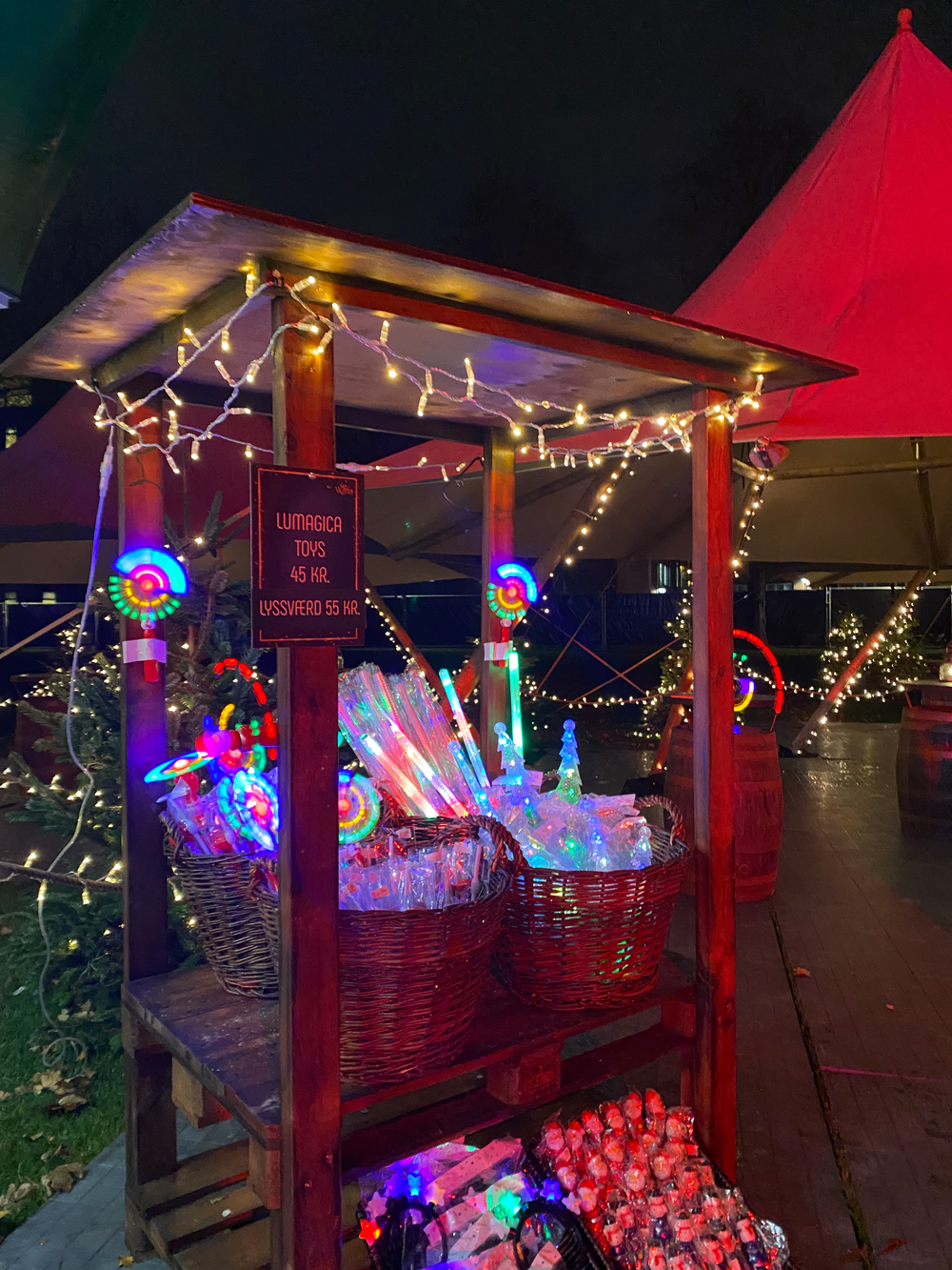 Vi skaber stemningsfulde omgivelser med lys, photo points, lysende highlights og elegante salgsboder – alt kan lejes og tilpasses jeres behov.