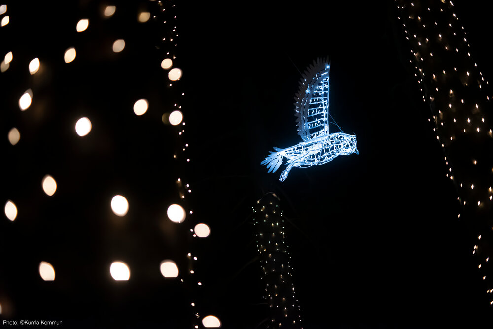 After the success the city decided to evolve the park for 2023. This year MK Illumination Sweden has added more motives and started planning for new zones in 2024. But the main addition is various motives running all the way from the central station, through the city centre to the park, to be able to tell the story all through the city. The stories have been picked up on by the city’s marketing team who have transformed them into a multiple chapter story about the dragon and the animals of the park. Signs and music have also been added, making the Enchanted Lake a dynamic and multiple layered experience.
