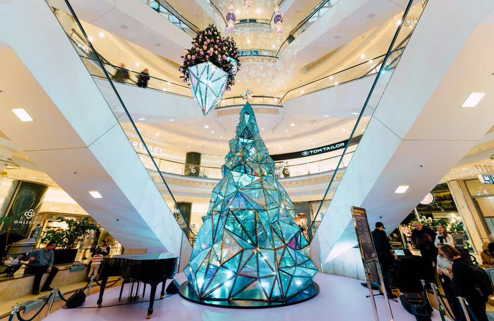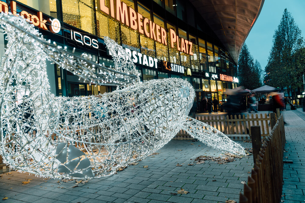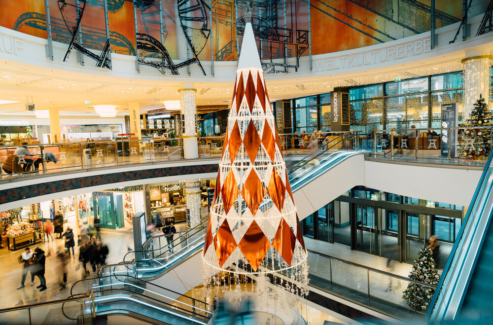 Under the theme of "Heart of the Ruhr Area" the Christmas lights brilliantly capture the essence of the design concept. Four monumental highlights await discovery, promising to envelop visitors in a world of enchanting wonder. A flying Christmas tree acting as a music box, creates a spell of festive cheer. Meanwhile, a rotating platform unveils the winter silhouette of Essen. The event area boasts a kaleidoscope tree adorned with reflective facets, radiating brilliance alongside flying Christmas trees and jewelry hangers.