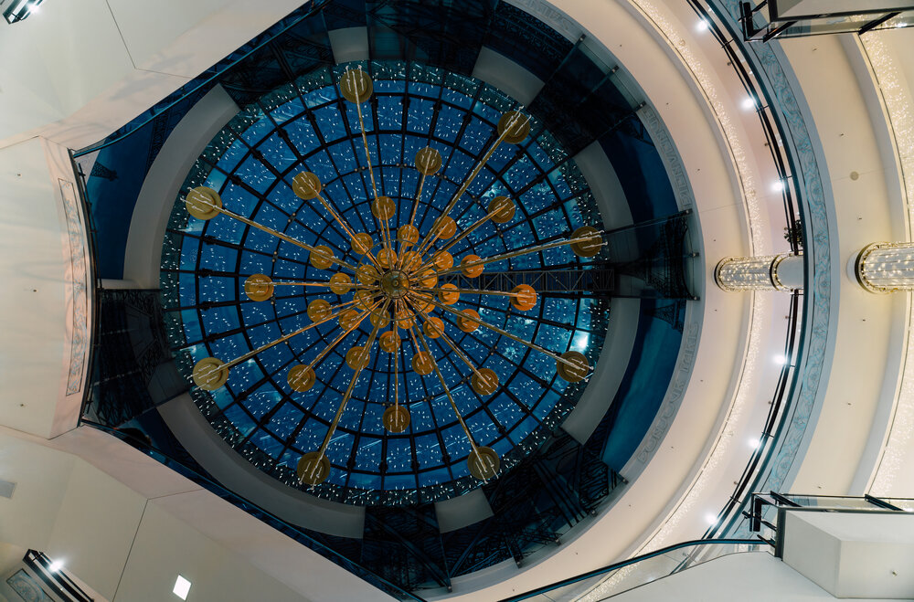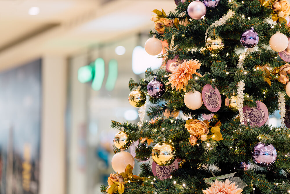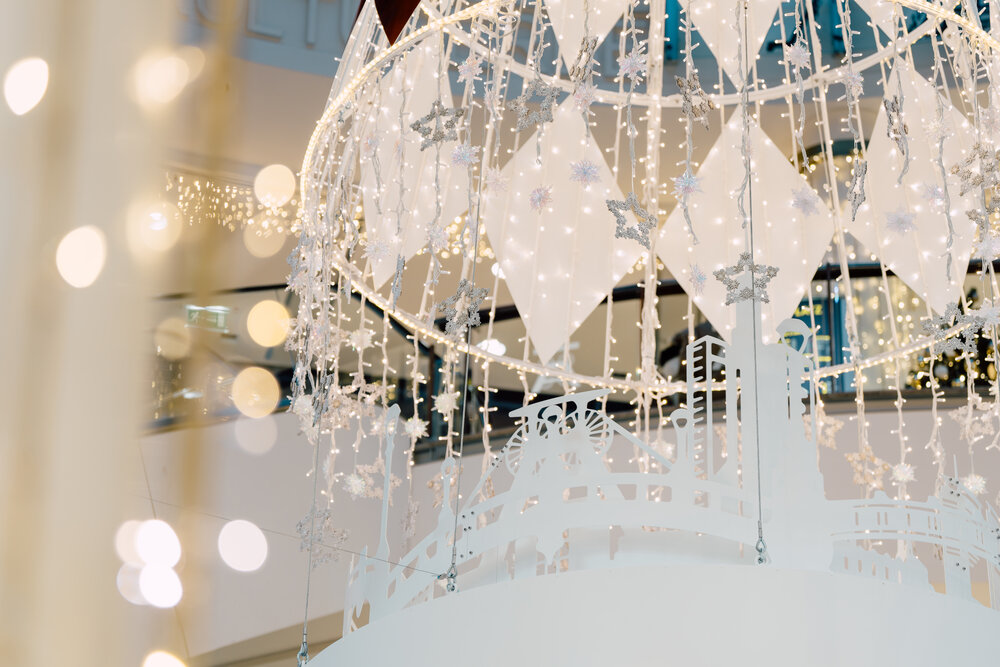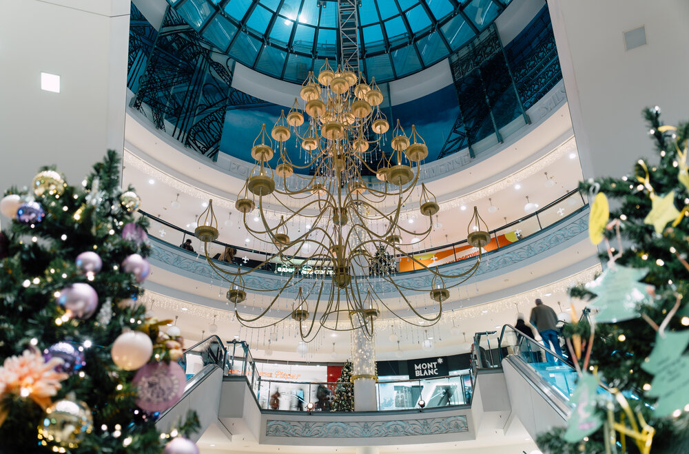 In another rotunda, a golden crystal chandelier takes on the form of a Christmas tree, releasing elegance. The grand finale showcases a heart crafted from charcoal, encircled by shimmering lights and luminous Christmas wreaths.