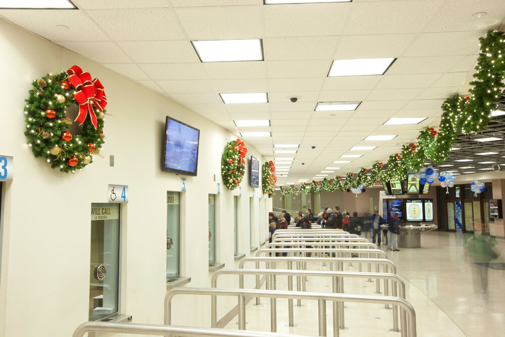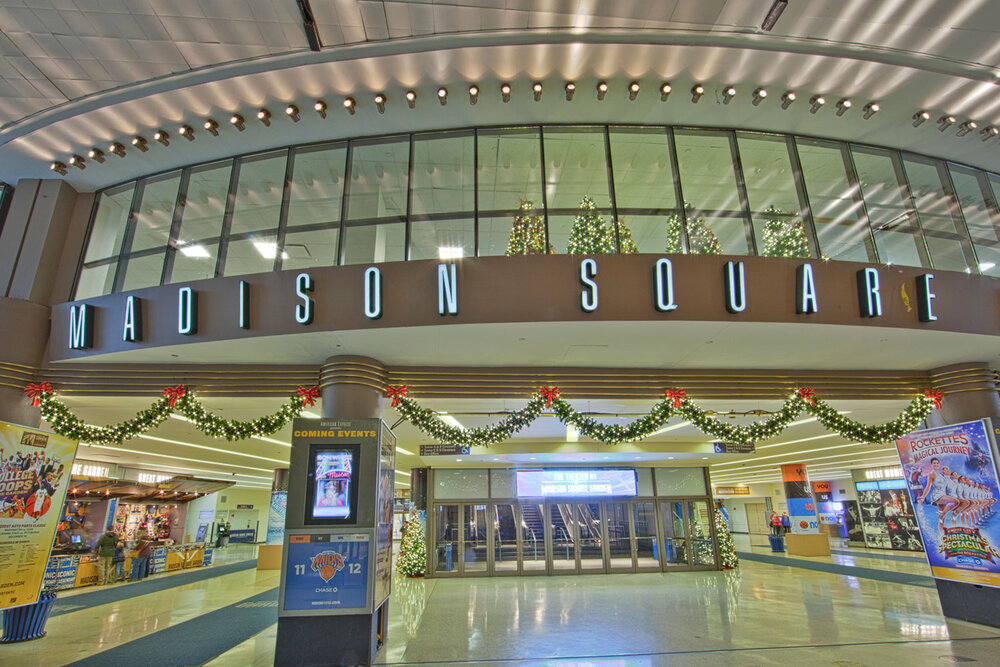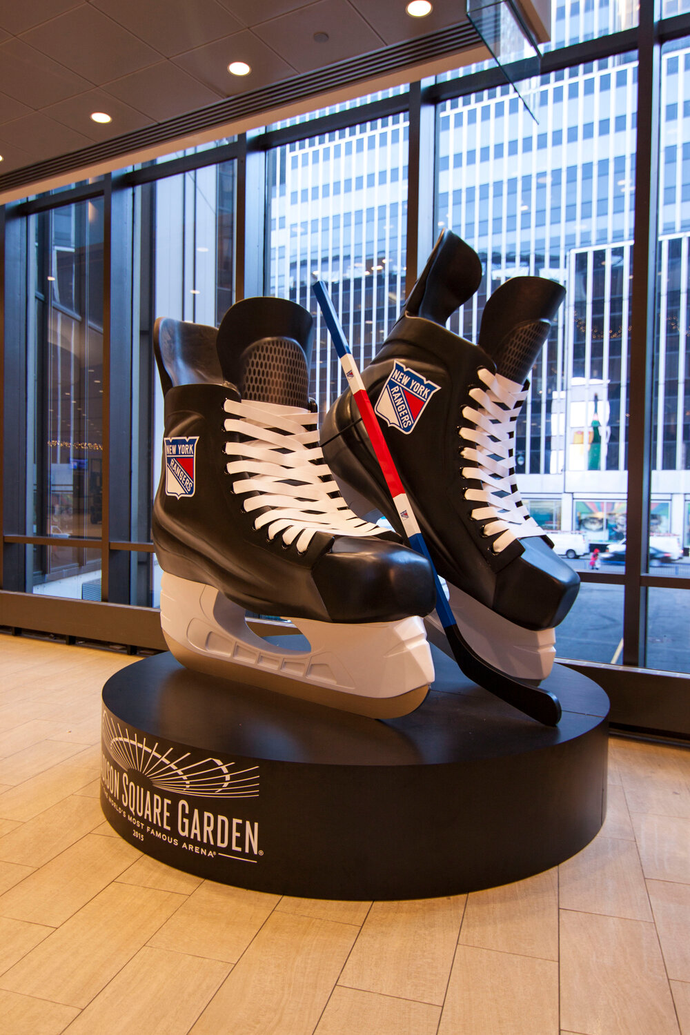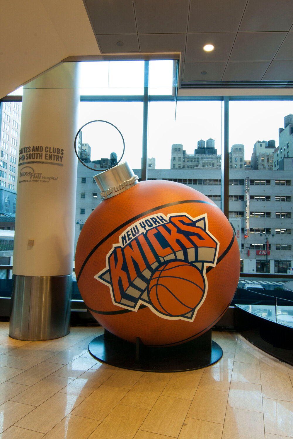 For this Project MK Illumination's American Christmas combined lights, greenery and custom festive motifs in the form of ice skates and an oversized basketball Christmas bauble to create the perfect festive atmosphere in Chase Square at Madison Square Garden.