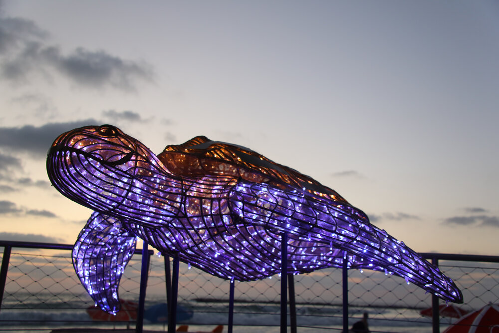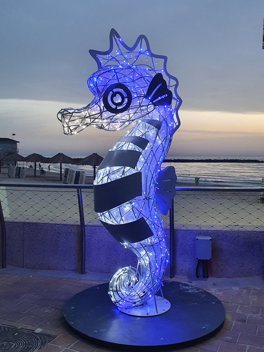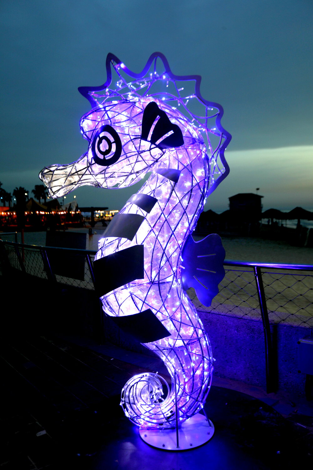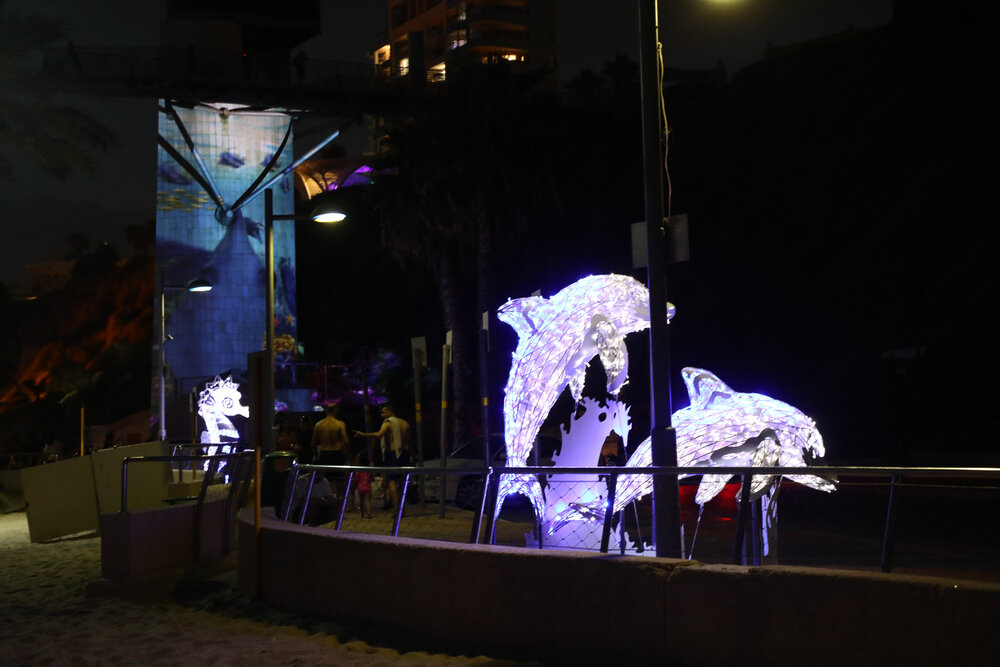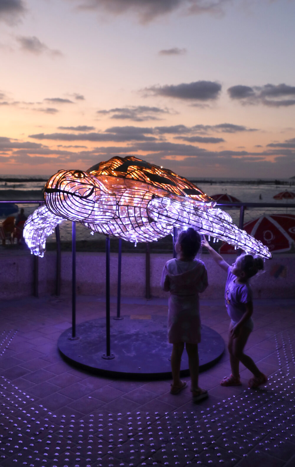 The project combines two different kinds of lightning elements, 3 light statues of sea animals and a video-mapping that's screamed next to them. We wanted the two lightning elements to speak together, so we chose the same animals to appear both in the projected video and the light statues.