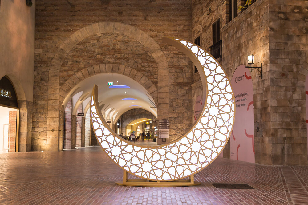As visitors entered the Outlet Village during Ramadan, they were greeted by giant fanous (lanterns) twinkling with light. The lanterns were painted in gold to create a stunning effect day and night.