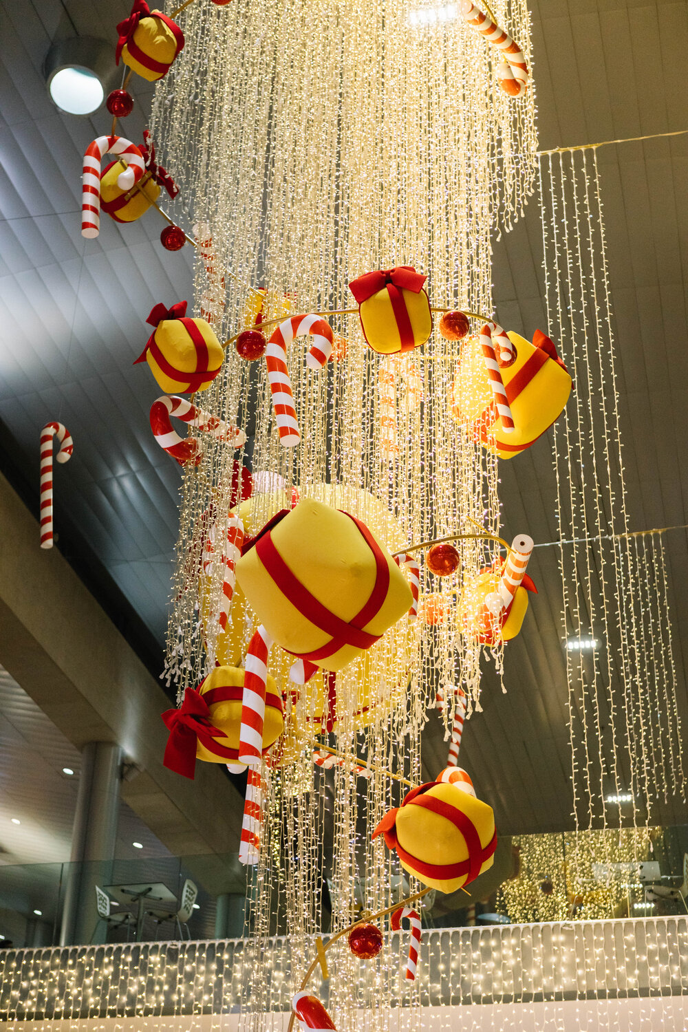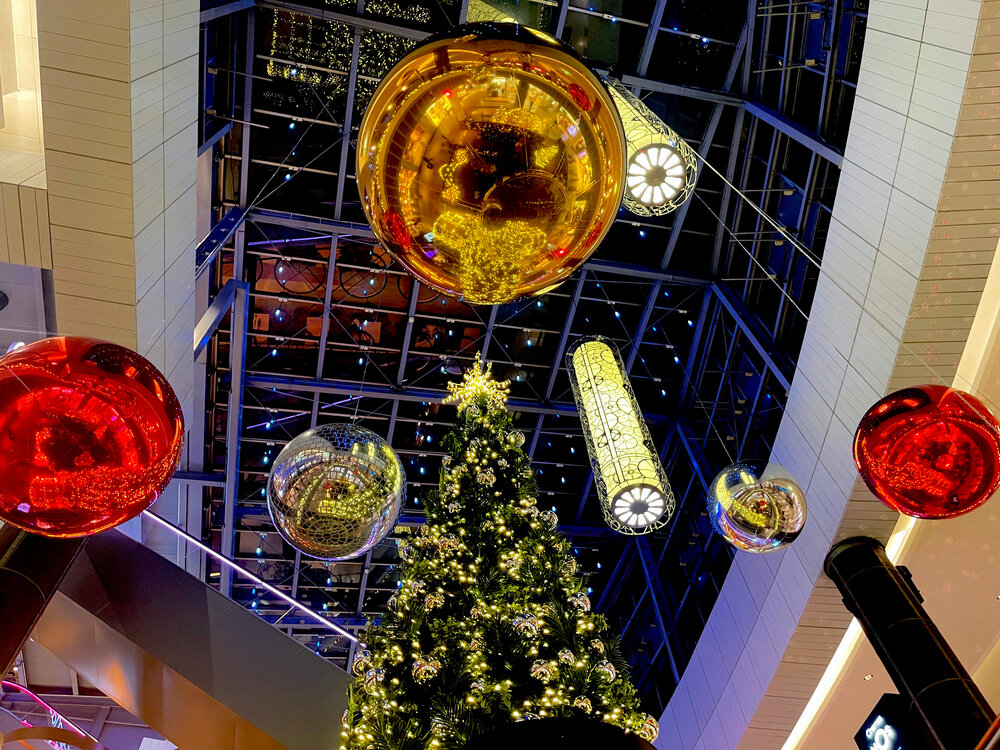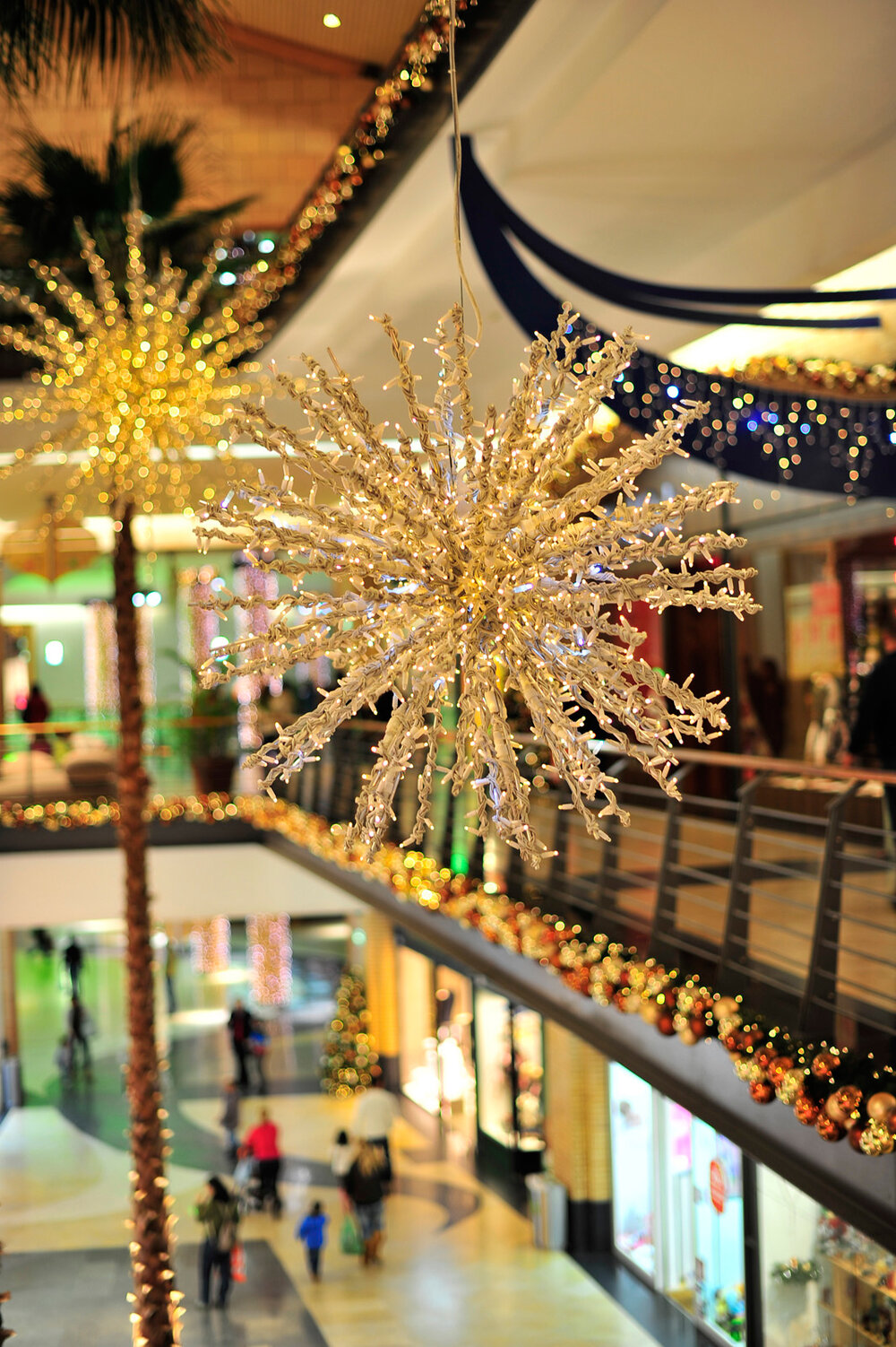 Selected supporting columns throughout the center were decorated with draping lights that fell in straight lines from top to bottom. On each level of the center, atrium balconies were decorated with golden baubles and twinkling lights embedded in greenery, as were the ceilings of walkways and the sides of each escalator. String lights adorned special architectural features in uneven cascades, bringing icicles to mind.