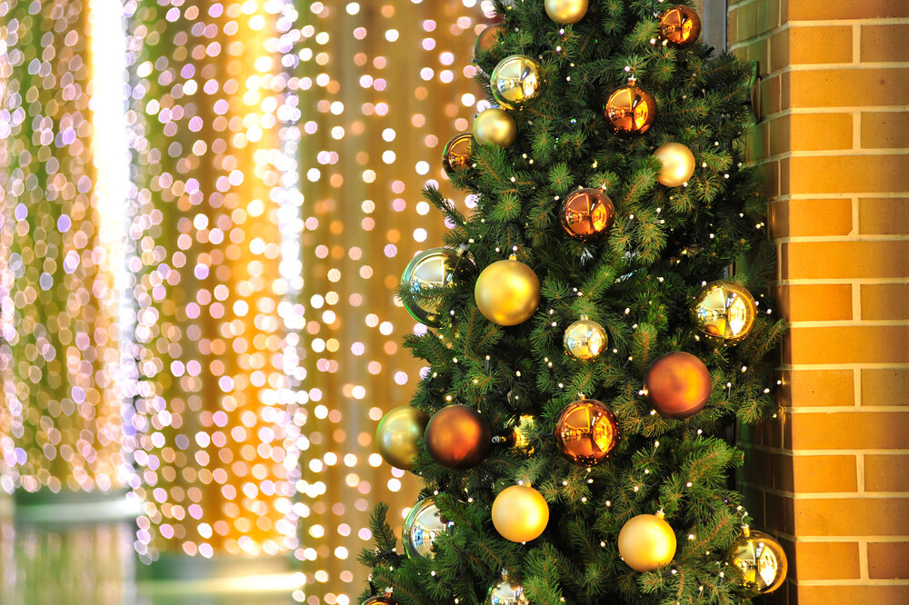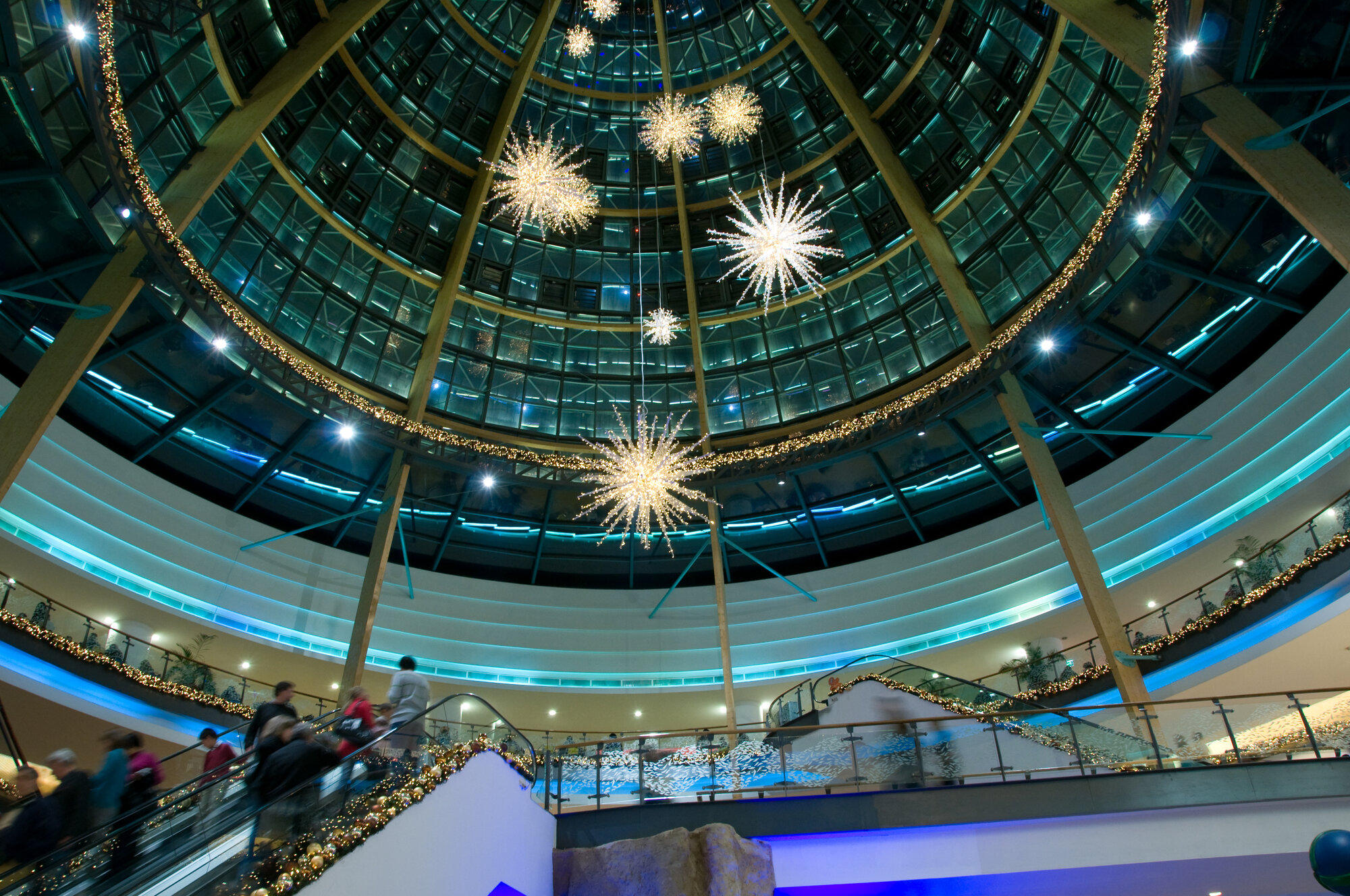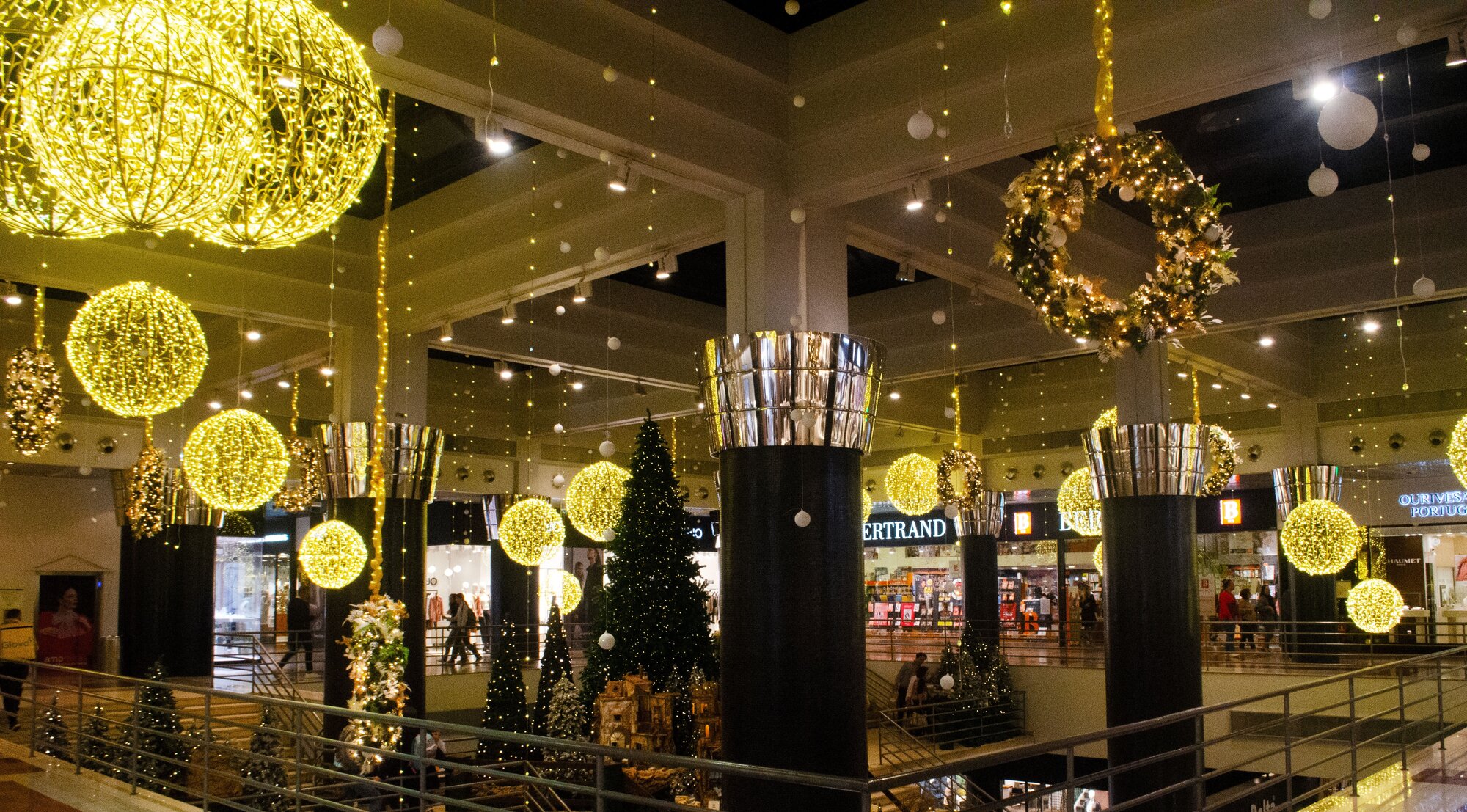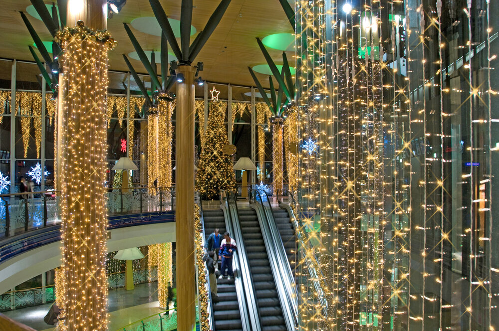 Selected supporting columns throughout the center were decorated with draping lights that fell in straight lines from top to bottom. On each level of the center, atrium balconies were decorated with golden baubles and twinkling lights embedded in greenery, as were the ceilings of walkways and the sides of each escalator. String lights adorned special architectural features in uneven cascades, bringing icicles to mind.