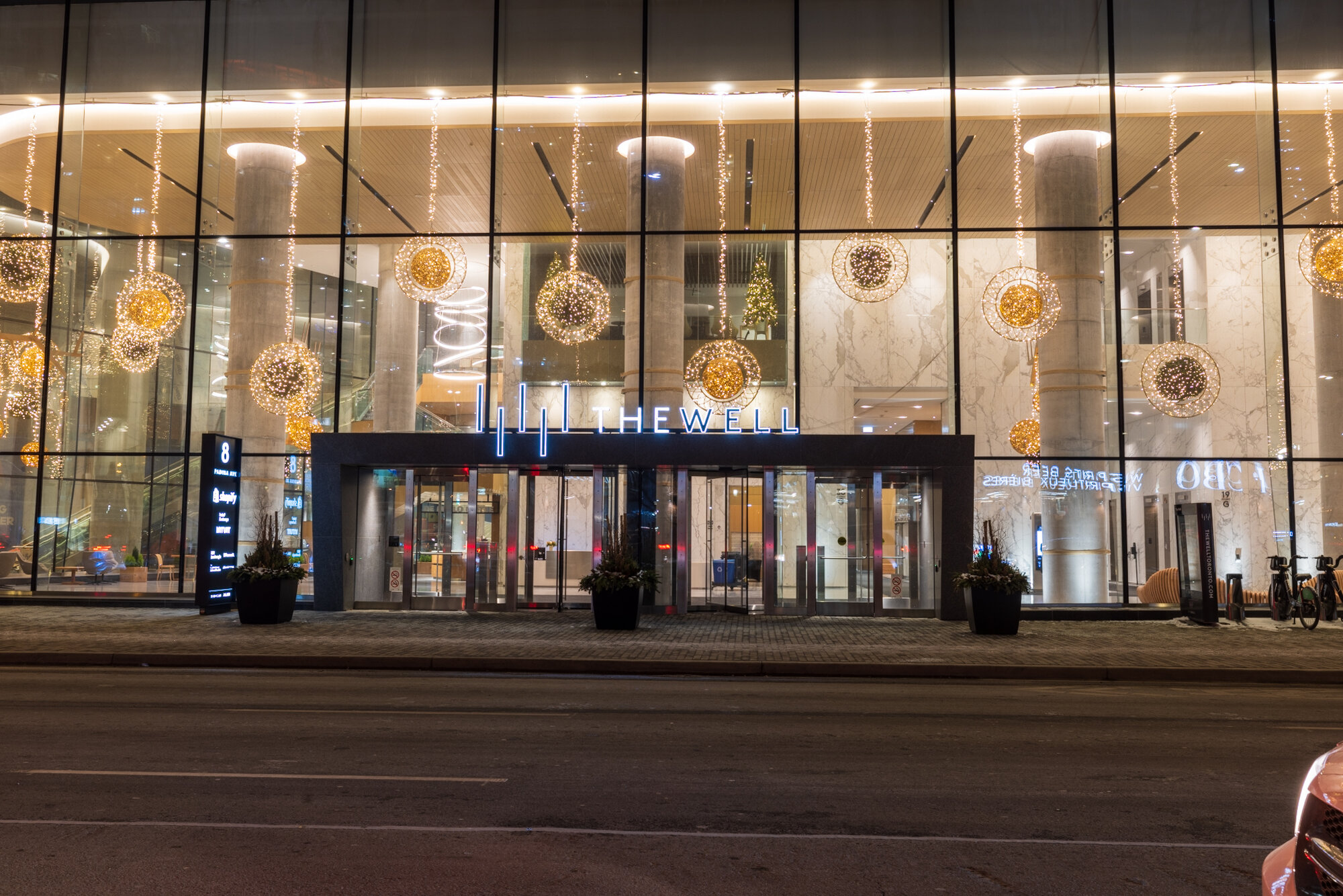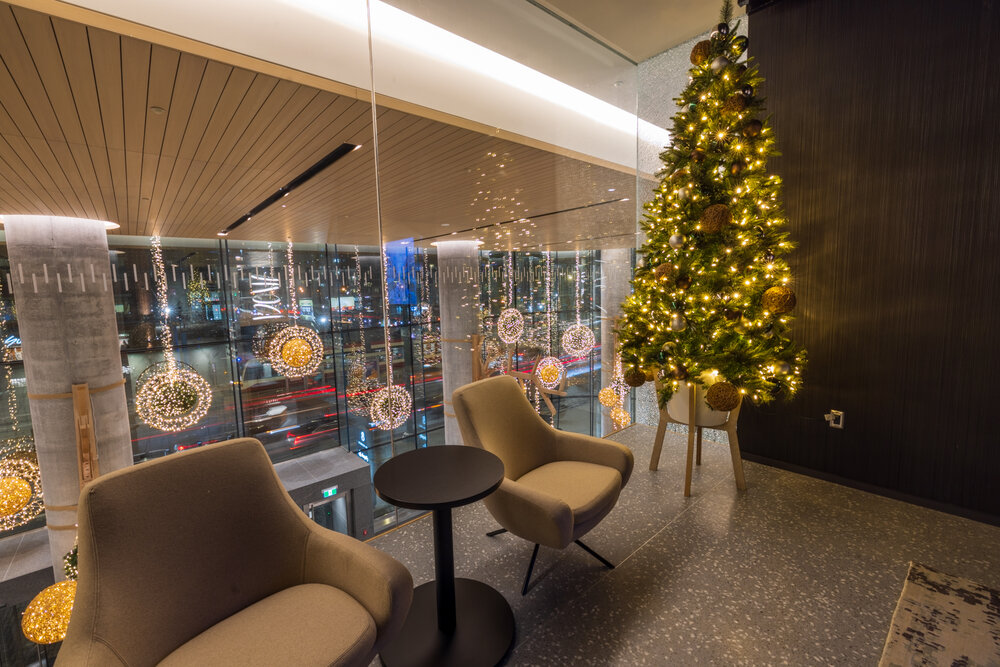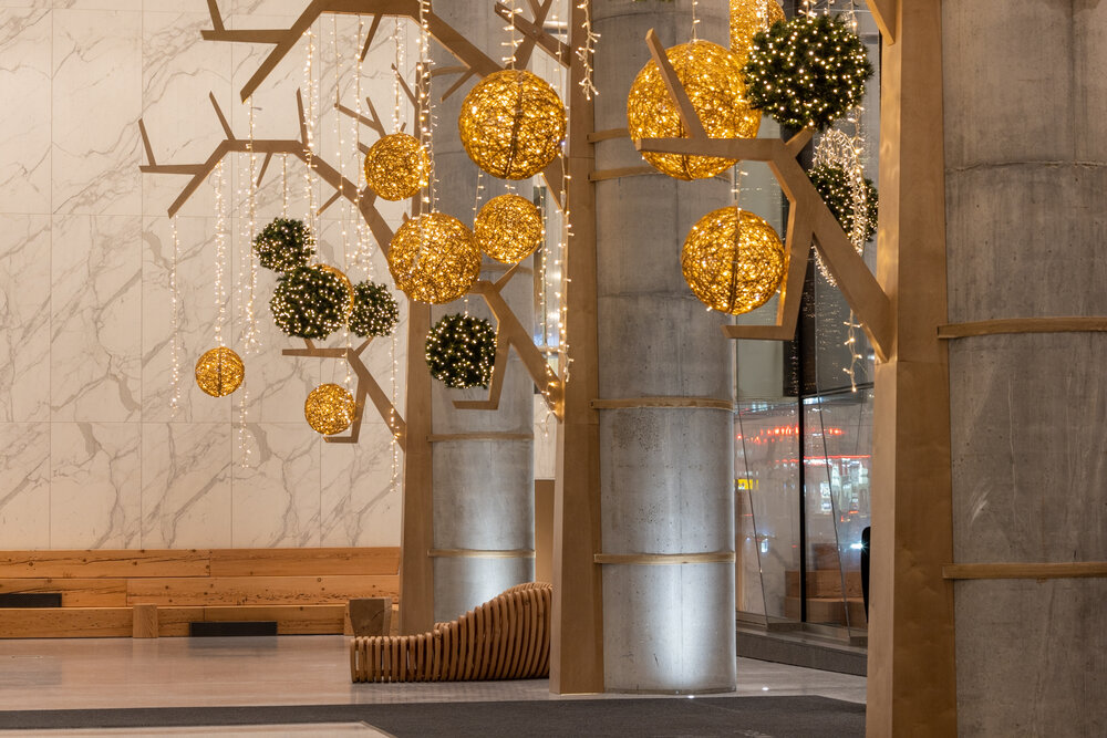 With its refined, natural style, this enchanting décor captures the vision and values of the prestigious Toronto complex and surrounds clientele in an inspiring atmosphere. The Well is an eco-responsible design featuring organic and sustainable materials such as wood. Custom-made tree sculptures by local artisans and suspended glittering balls, featured both inside and outside the premises, dazzle guests.